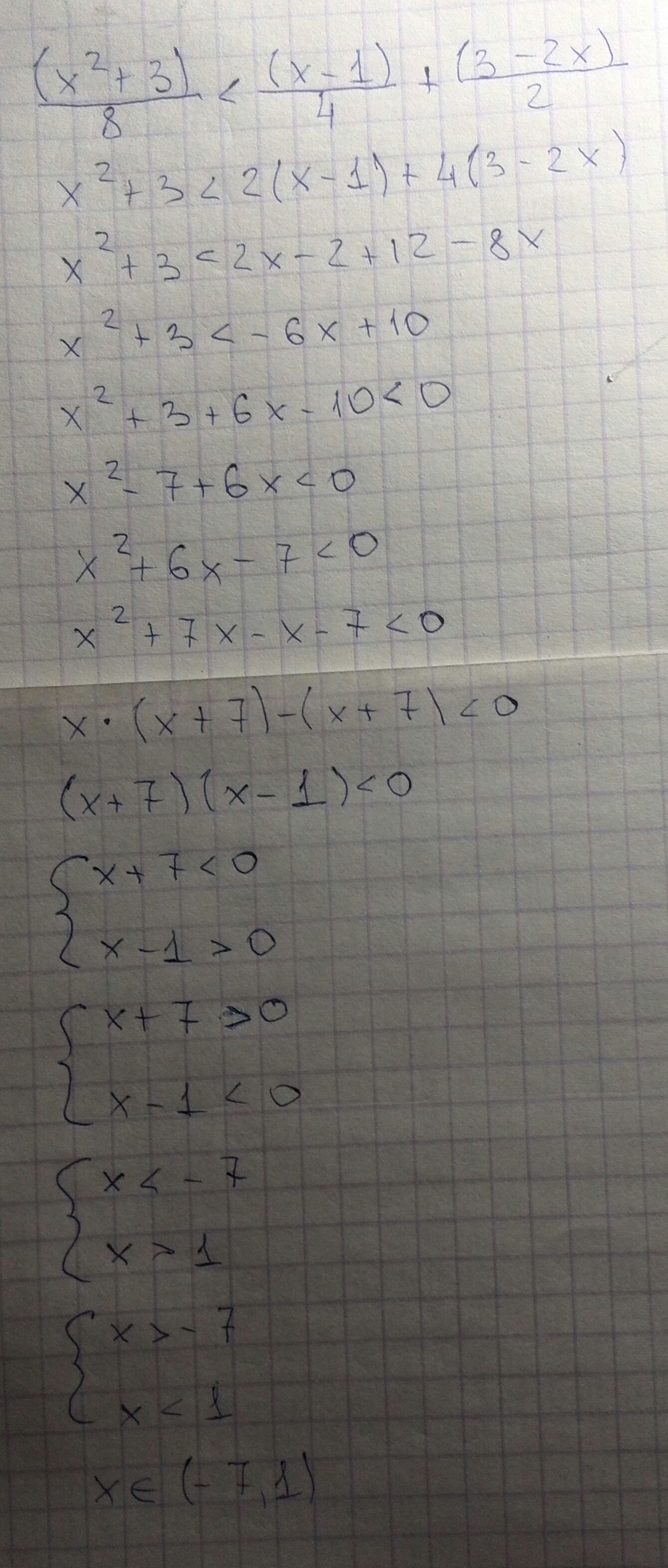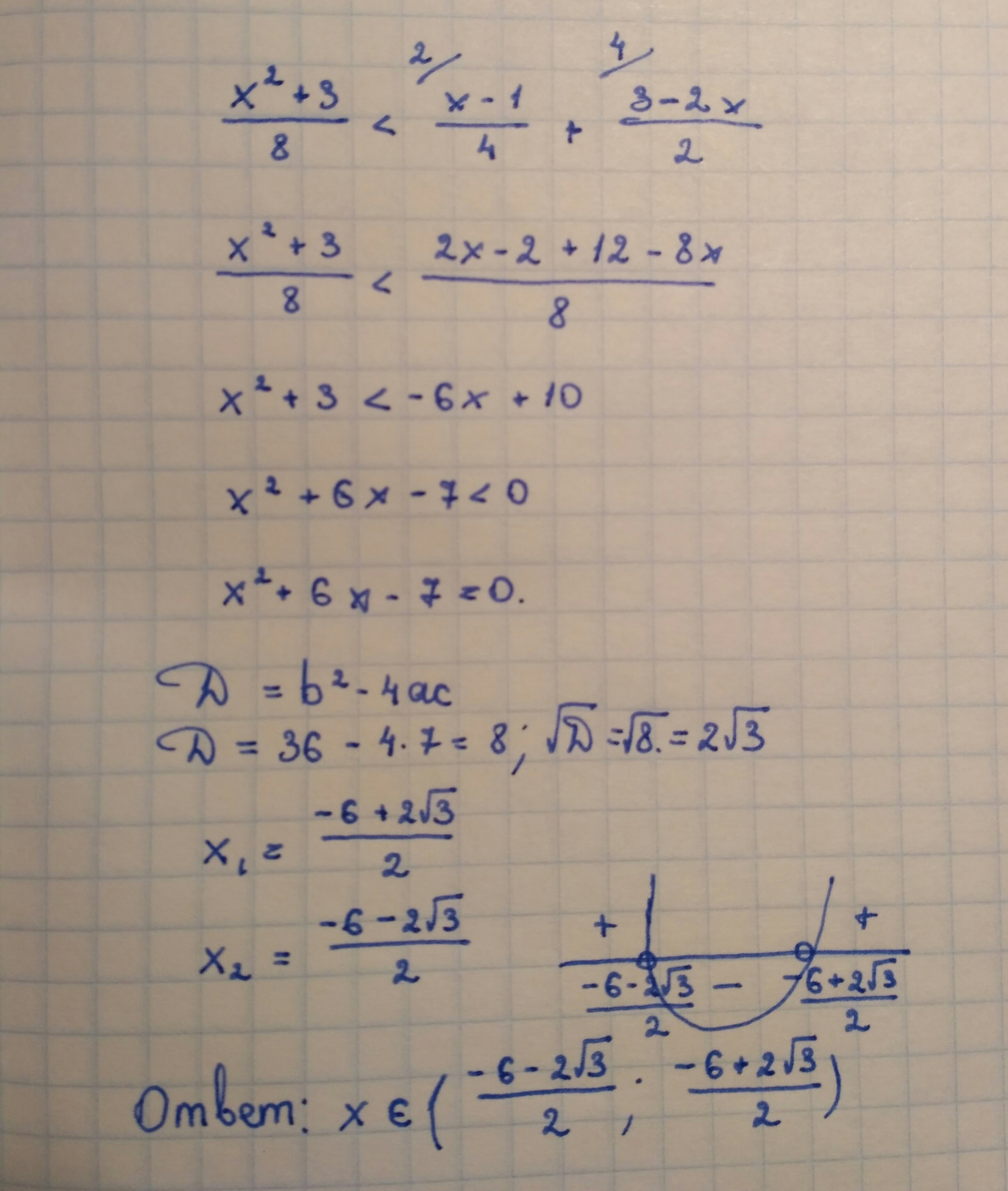семёрка с минусом была-то, там в дискриминанте получается b^2 – 4ac = 6^2 – 4*1*(–7) = 36 + 28 = 64 = 8^2