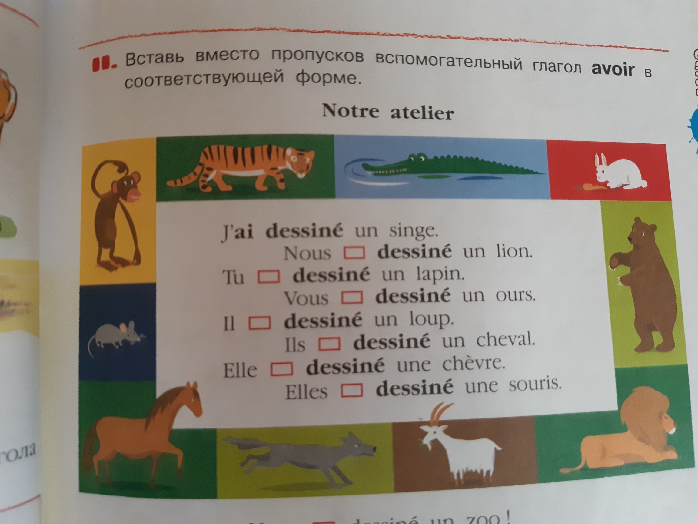 J'ai dessiné un singe.Nous avons dessiné un lion.Tu as dessiné un lapin.Vous avez dessiné un ours. Il a dessiné un loup.Ils ont dessiné un cheval. Elle a dessiné une chèvre. Elles ont dessiné une souris.