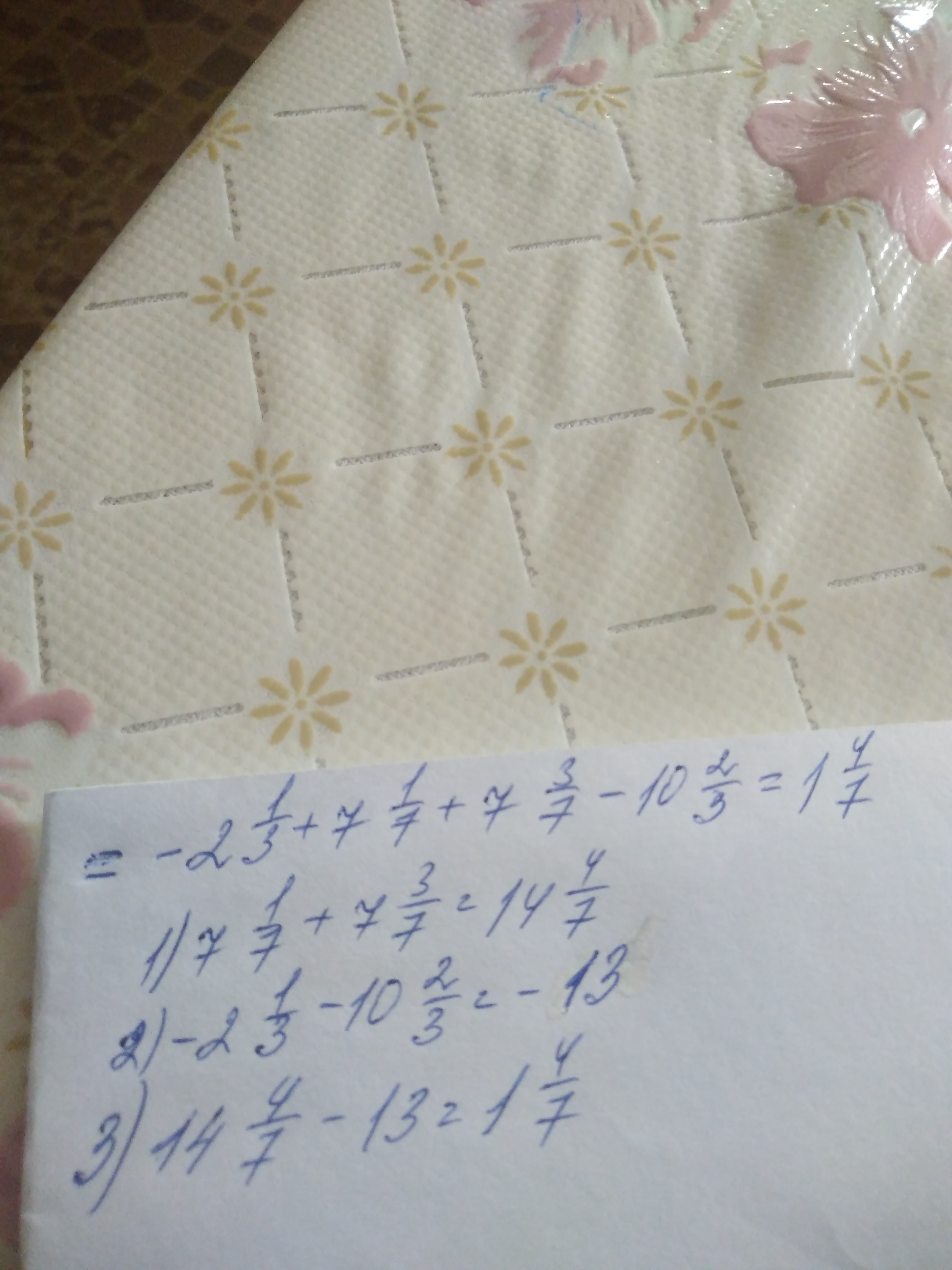 Помогите срочно пожалуйста решить это задание: До різниці чисел(-2 1/3) і (7 1/7) додати суму чисел 7 3/7 і (10 2/3)