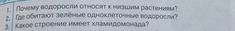 1) Водоросли относят к низшим растениям, так как они не имеют ни корней, ни стеблей, ни листьев.