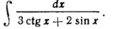int frac{dx}{3ctgx+2sinx}=[, t=tgfrac{x}{2},; x=2arctgt,; dx=frac{2dt}{1+t^2},; sinx=frac{2t}{1+t^2},\\cosx=frac{1-t^2}{1+t^2},; ctgx=frac{cosx}{sinx}=frac{1-t^2}{2t}; ]=int frac{frac{2dt}{1+t^2}}{frac{3(1-t^2)}{2t}+frac{2cdot 2t}{1+t^2}}=\\=int frac{frac{2, dt}{1+t^2}}{frac{(3-3t^2)(1+t^2)+4tcdot 2t}{2t(1+t^2)}}=int frac{4t, dt}{3+3t^2-3t^2-3t^4+8t^2}=int frac{4t, dt}{-3t^4+8t^2+3}=\\=-frac{4}{3}int frac{t, dt}{t^4-frac{8}{3}t^2-1}=-frac{4}{3}int frac{t, }{(t^2-frac{8}{3cdot 2})^2-frac{16}{9}-1}=-frac{4}{3}int frac{t, dt}{(t^2-frac{4}{3})^2-frac{25}{9}}=