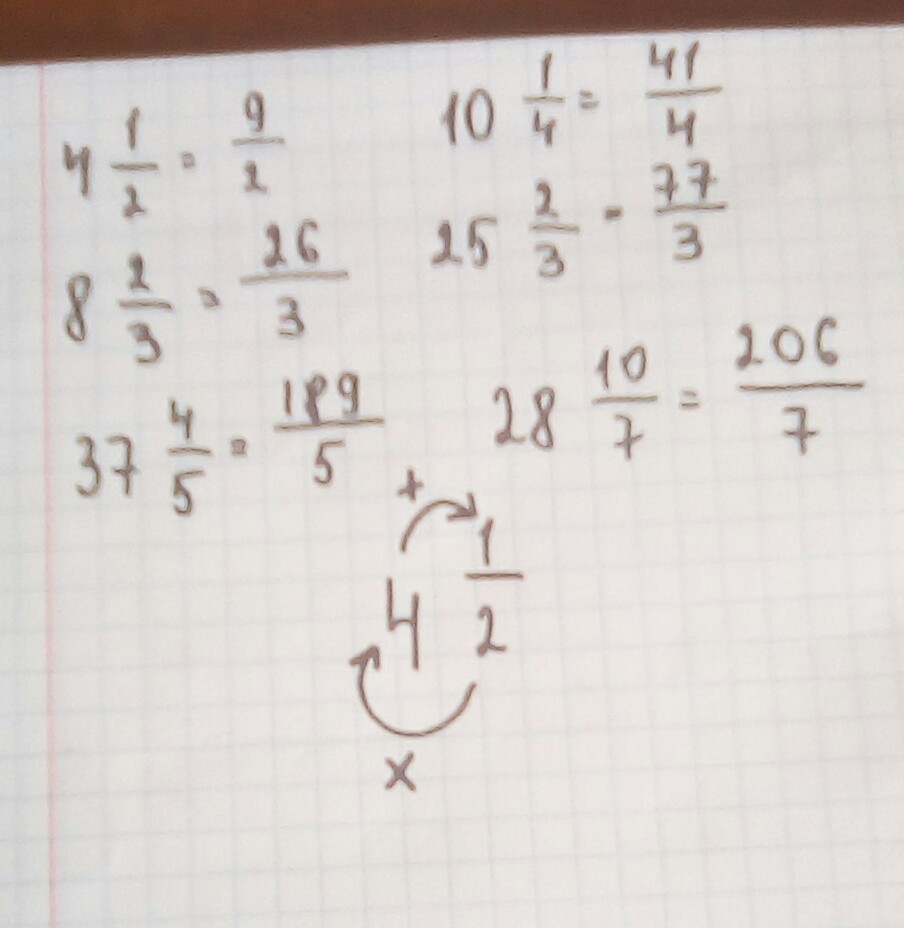Запишите в виде неправильных дробей следующие числа 4 целых 1/2, 8 целых 2/3, 10 целых 1/4, 25 целых 2/3, 37 целых 4/5, 28, 10, 7. Спасибо заранее.