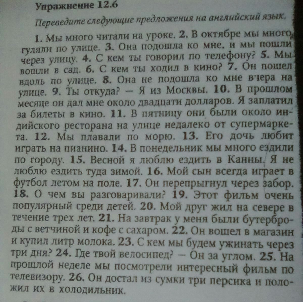 1. We read a lot at the lesson. 2. In October we walked a lot along the street. She came up to me. and we went across the street. 4. Who did you talk on the phone with? 5. We entered the garden. 6. Who did you go to the movies with? 7. He walked along the street. 8. She did not come up to me in the street. 9. Where are you from? I am from Moscow. 10. Last month he gave me about twenty dollars. I paid for the movie tickets. 11. On Friday they were near an Indian restaurant on the street near the supermarket. 12. We sailed the sea. 13. His daughter likes to play the piano. 14. On Monday we traveled a lot around the city. 15. In the spring I like to go to Cannes. I do not like to go there in the winter. 16. My son always plays football in the summer on the field. 17. He jumped over the fence. 18. What were you talking about? 19. This film is very popular among children. 20. My friend lived in the north for three years. 21. For breakfast I had sandwiches with ham and coffee with sugar. 22. He went into the store and bought a liter of milk. 23. With whom we will have supper in three days? 24. Where is your bicycle? - He's around the corner. 25. Last week we watched an interesting film on TV. 26. He took three peaches from his bag and put them in the refrigerator.