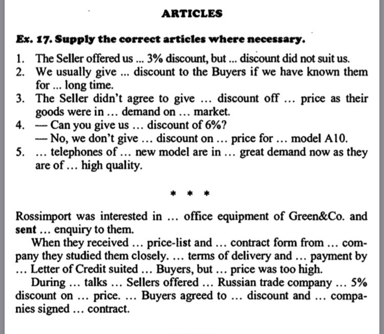 Rossimport was interested in the office equipment of Green&Co and send an enquiry. When they received a price-list and a contract from the company they studied them closely. The terms of delivery and payment by a Letter of Credits suited buyers, but the price was too high. During the talks Sellers offered Russian trade company a 5% discount on a price. The Buyers agreed to the discount and companies signed the contract