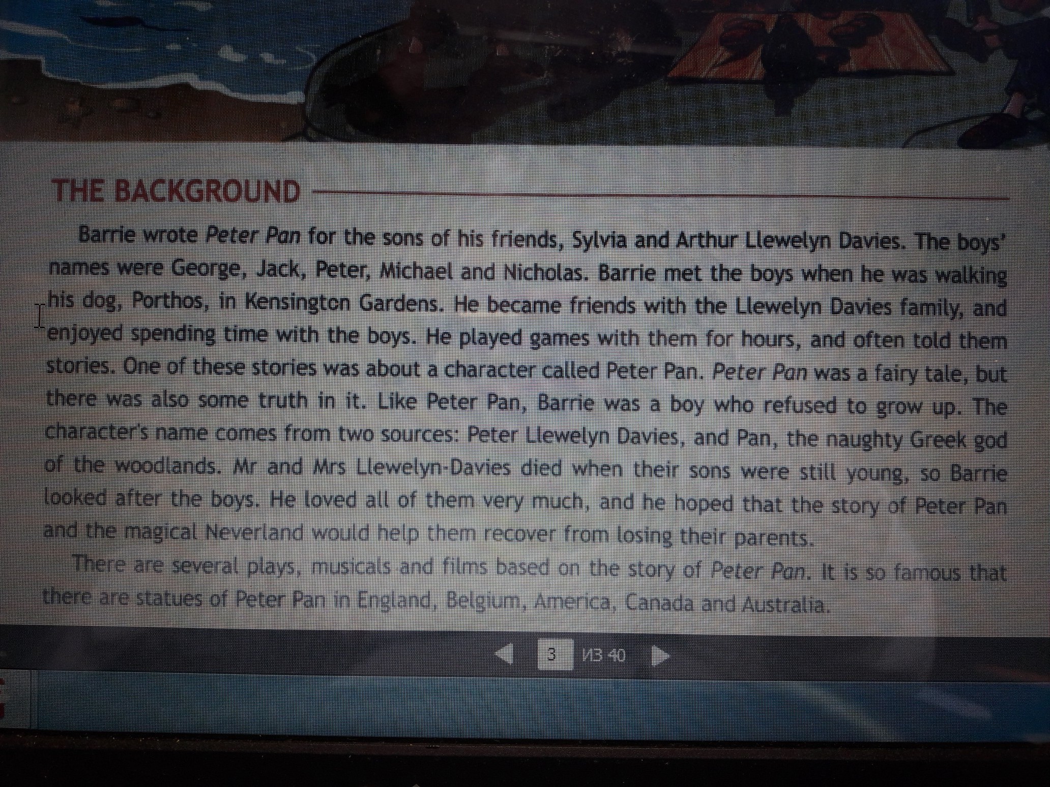 Бари написал Питера Пэна для сыновей своих друзей: Сильвии и Артура Дэвиса. Мальчиков звали Джордж, Джек, Питер, Майкл и Николас. Бари встретил мальчиков, когда он гулял с собакой по кличке Портос в Кенсингтонском саду. Он сталя хорошим другом для семьи Артура, и наслаждался, проведенным временем с мальчиками. Он мог играть с ними в игры часами,и часто рассказывал им истории.Одной из них была история о персонаже, которого звали Питер Пэн. Он был сказкой, но в то же время была и доля правды.Как и Питер Пэн, Бари не хотел расти. Имя персонажа произошло от имен: Питер Дэвис и Пэн, непослушный греческий бог редколесья.Мистер и миссис Дэвис погибли, когда их дети были настолько юны, поэтому Бари присматривал за мальчиками. Он любил их всех очень сильно, и он надеялся, что история Питера Пэна и магическая страна Нетландия поможет им прийти в себя после смерти родителей.