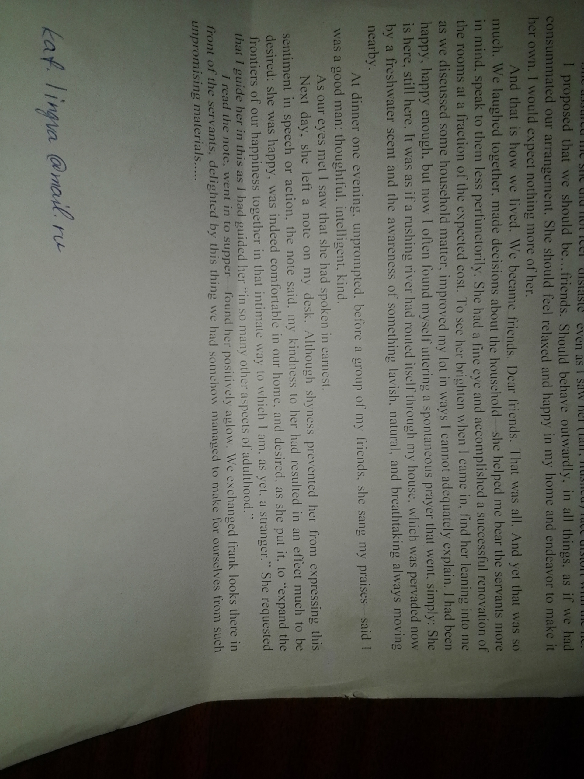 На следующий день она оставила записку на моем столе. Она была скромна, что ей не позволяло проявлять свои чувства в словах или действиях. Но записка гласила о том, что моя доброта к ней достигла результатов больше, чем было нужно: она была счастлива, желанна, чувствовала себя довольно комфортно в нашем доме. Она хотела преодолеть грани нашего совместного счастья более интимным путем, в котором я вел себя странно. Она просила, чтобы я помог ей в этом, как я помог ей и во множественных аспектах взрослой жизни.