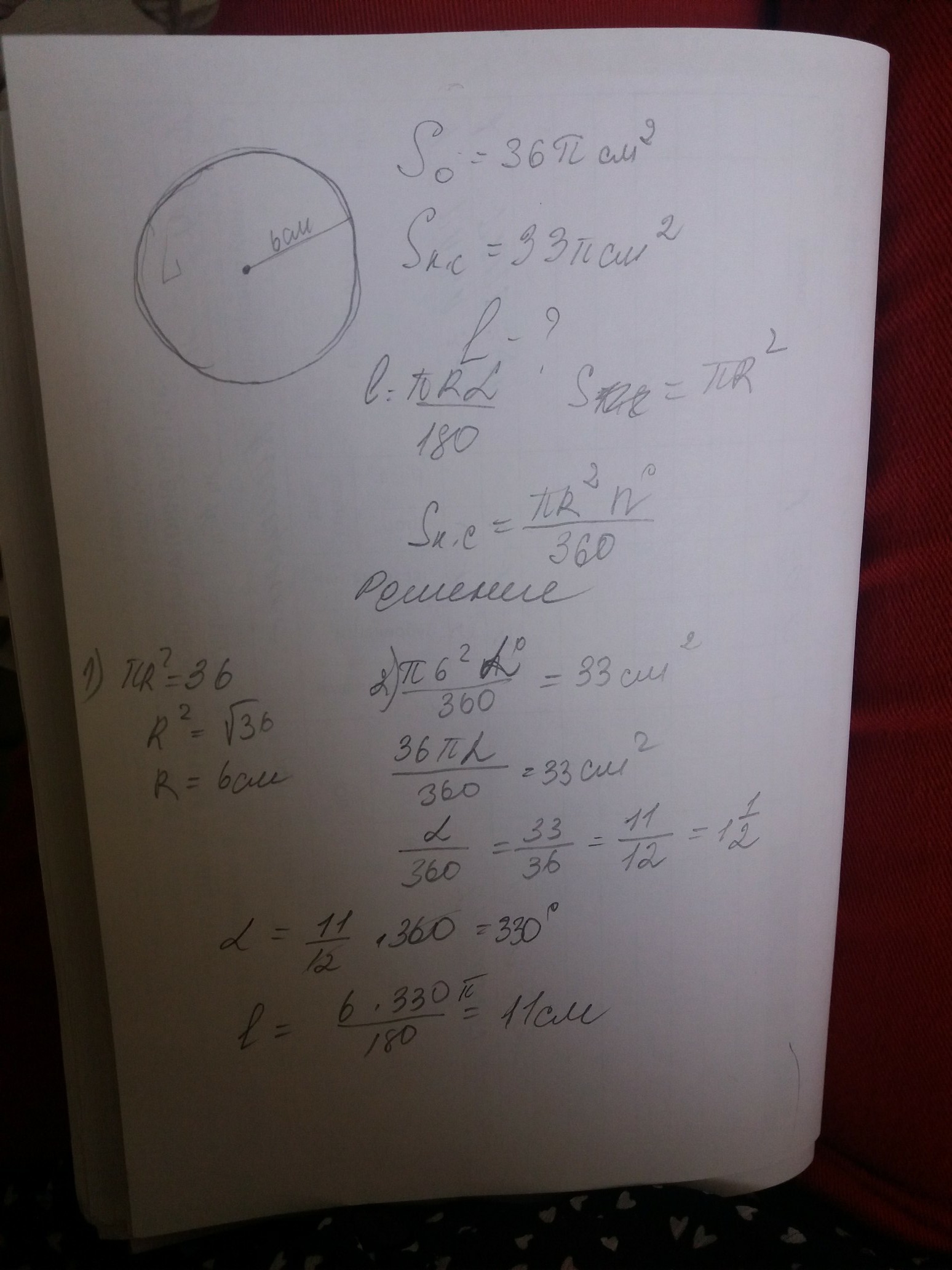 Площа круга дорівнює 36π см2. Знайдіть довжину дуги, що обмежує круговий сектор, площа якого дорівнює 33π см2.