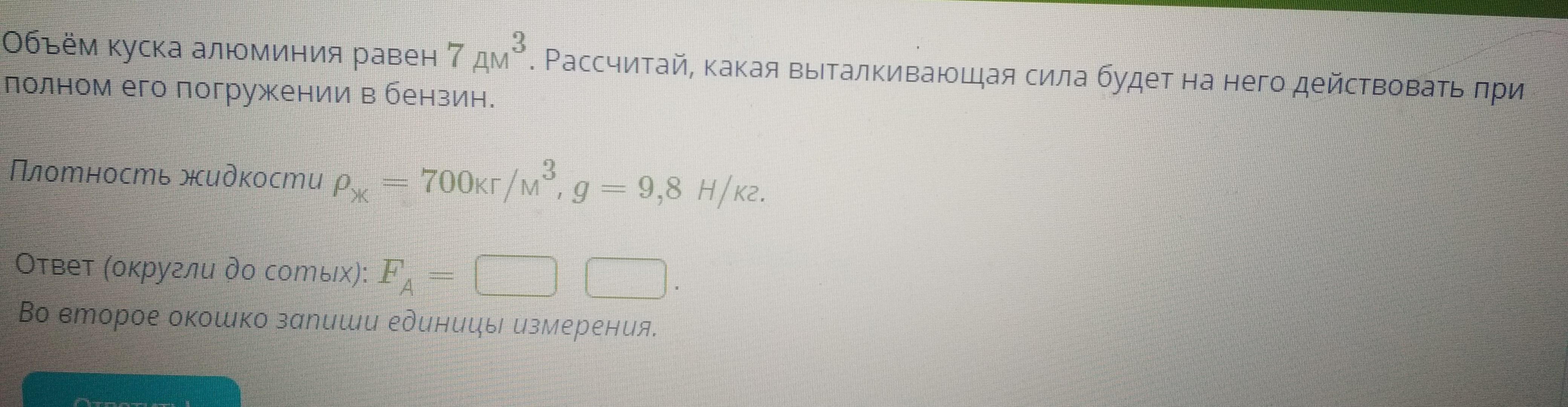 F=700 кг/м³ * 7дм³ * 9,8 н/кг