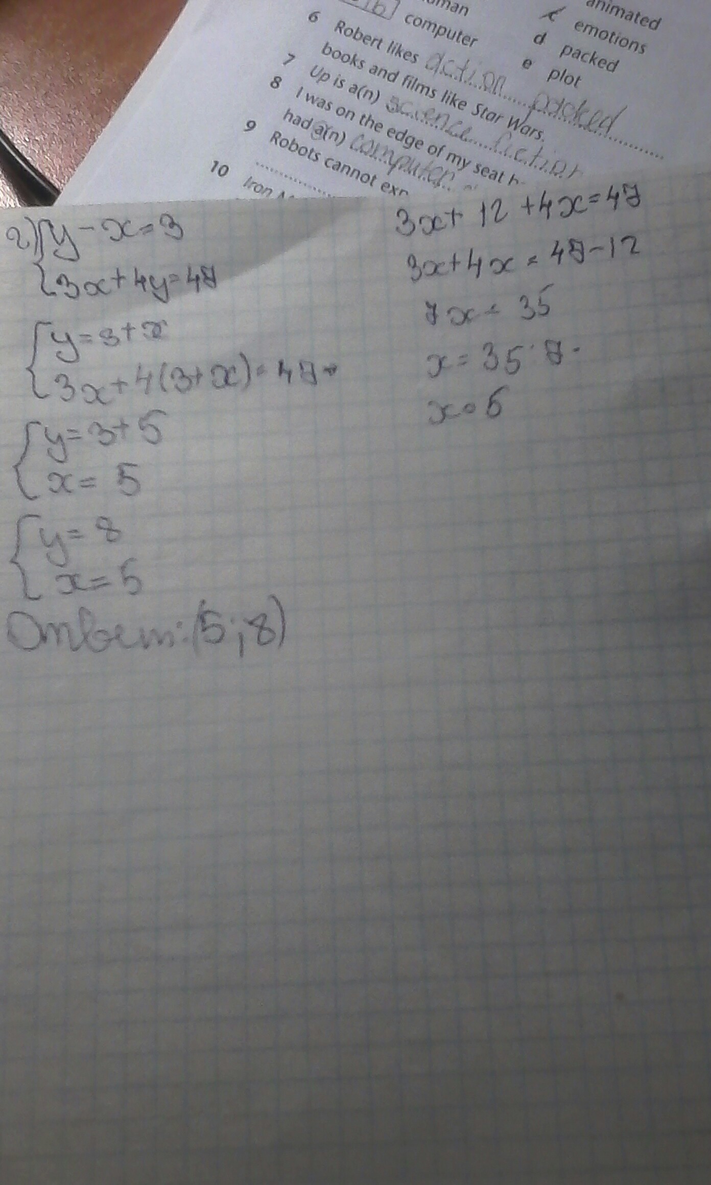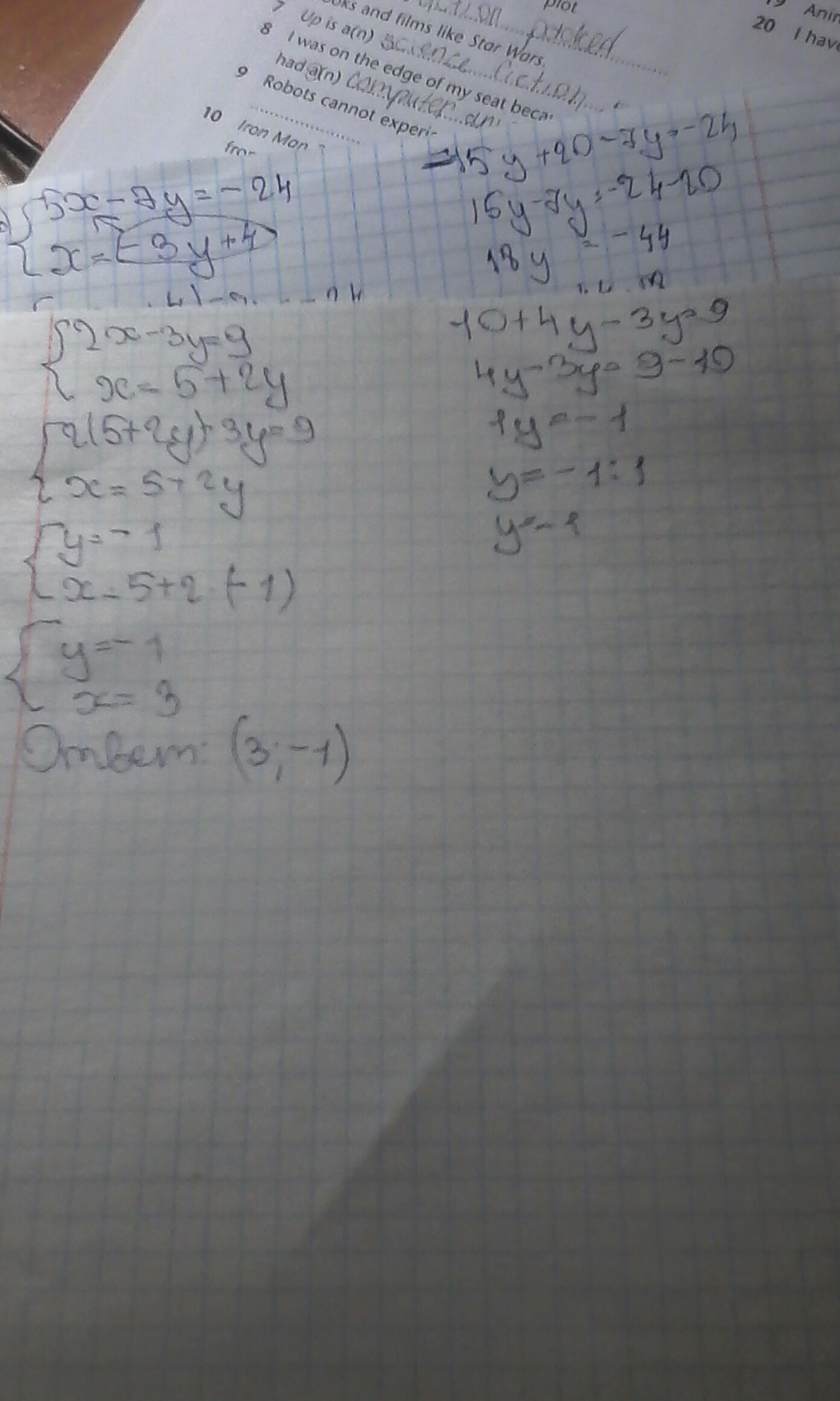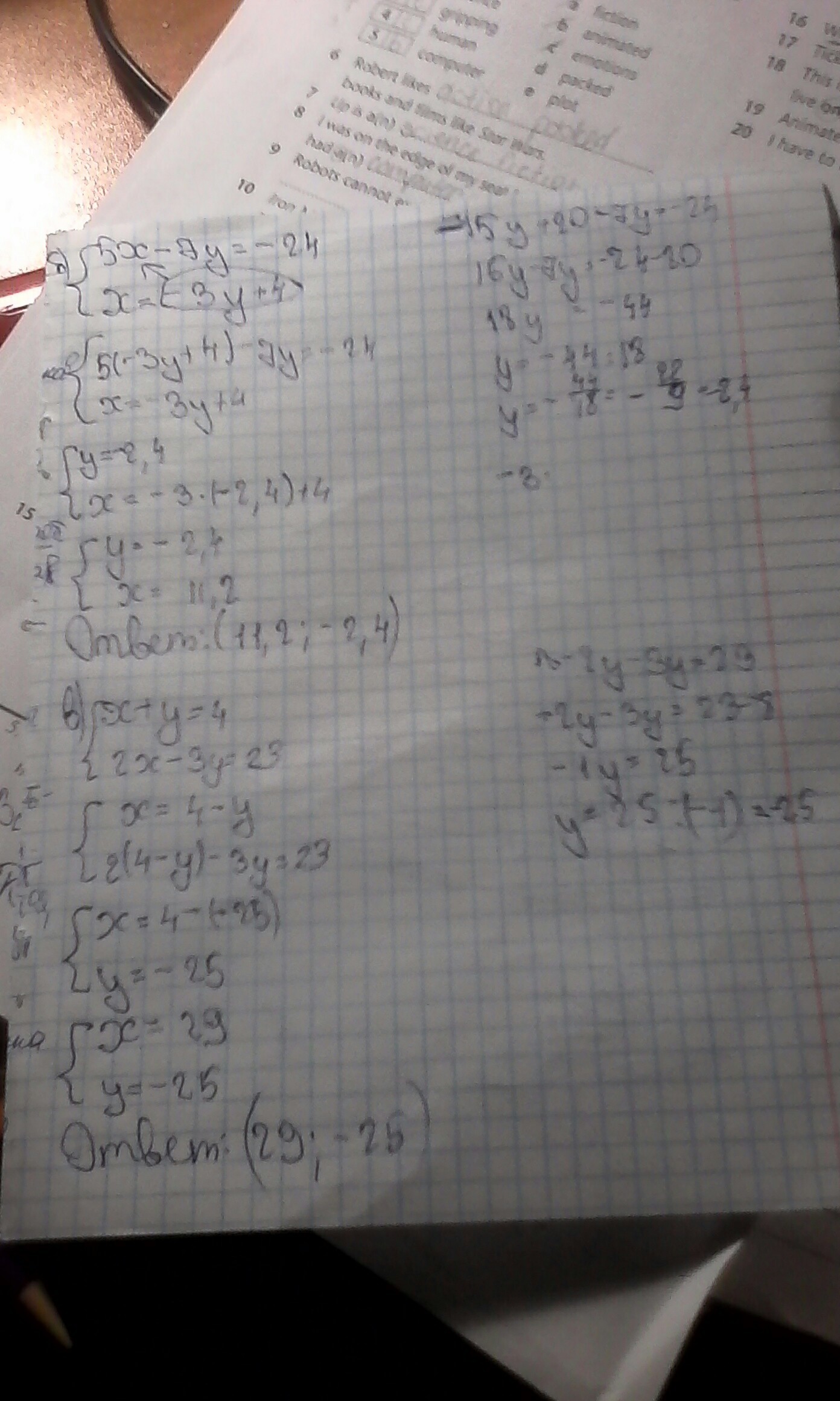 б)5x-7y=-24
