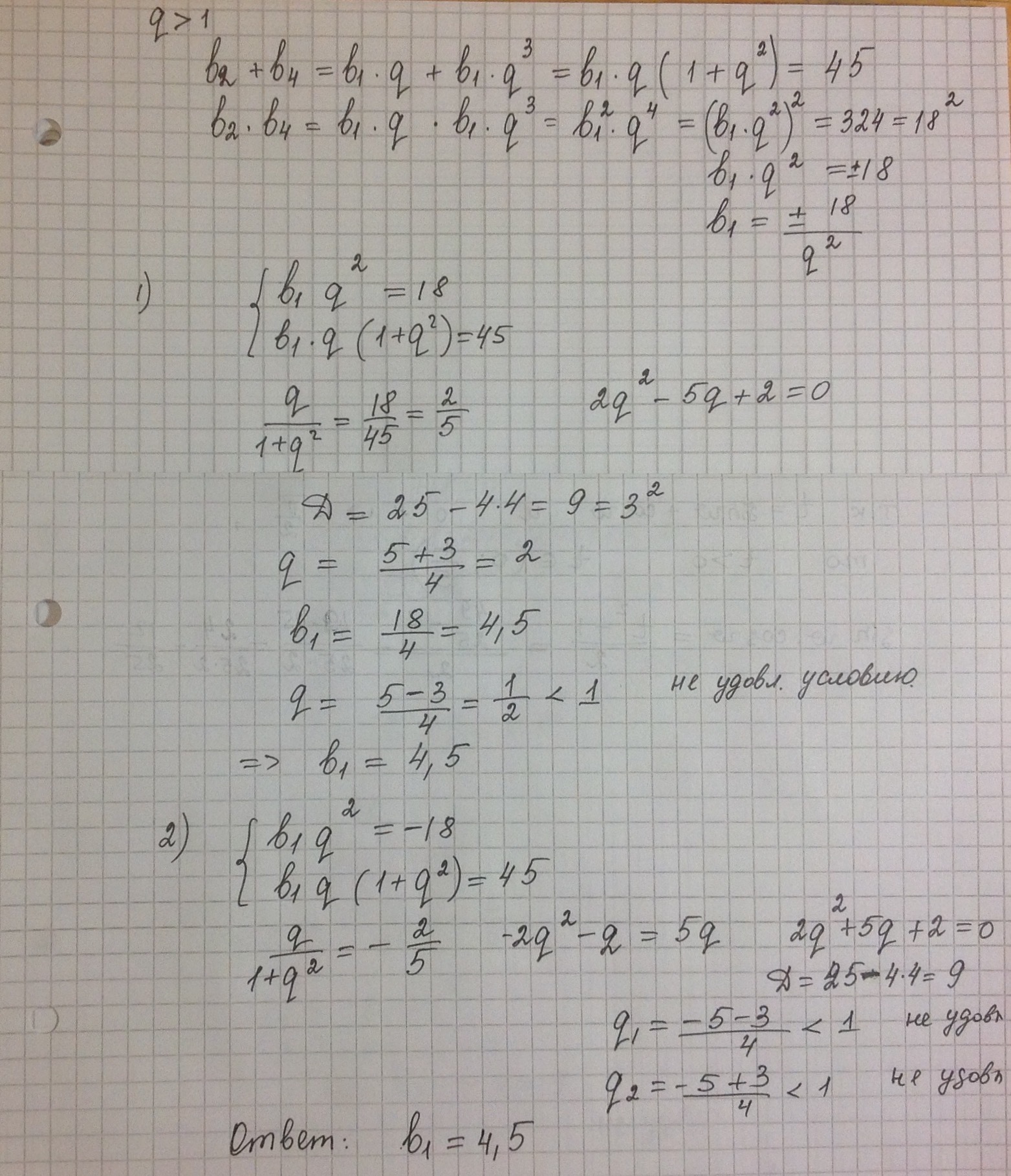 Сума другого та четвертого членів зростаючої геометричної прогресії дорівнює 45, а їхній добуток - 324. Знайдіть перший член прогресії.