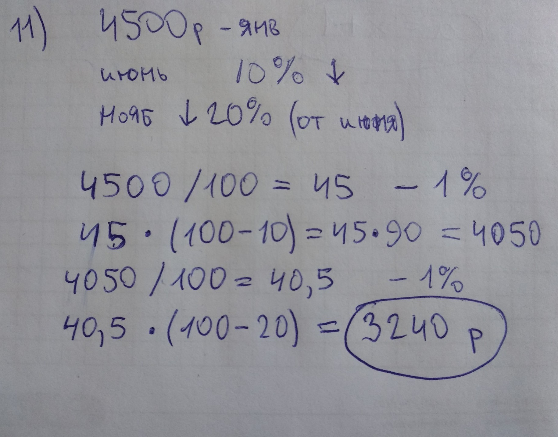 в 11 ответ будет 3240р, сперва мы должны найти 90% это будет стоимость за июнь, а затем мы находим 80% от этой стоимости и получаем нужный нам ответ.