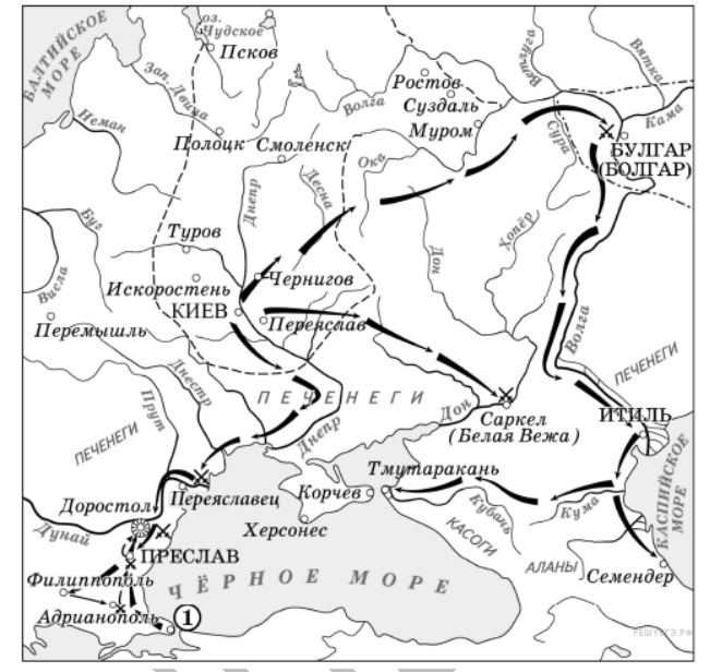 2) Назовите князя, совершившего походы, обозначенные на карте стрелками.