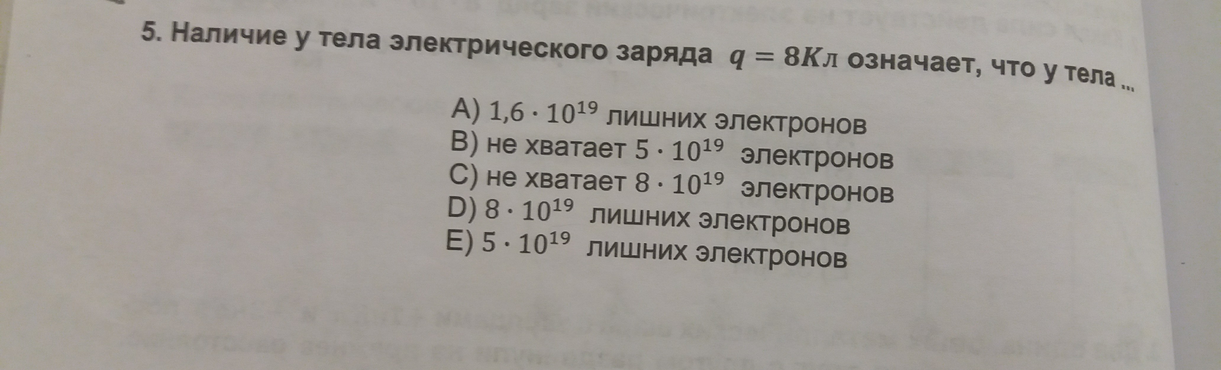 Означает , что у тела не хватает 5·10^19 электронов. Ответ Б.