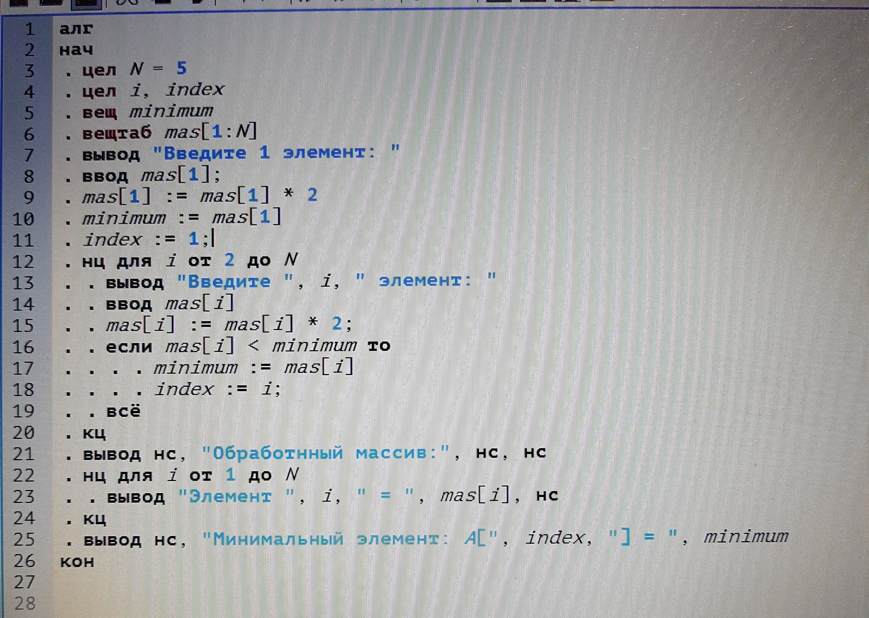 вывод нс, "Минимальный элемент: A[", index, "] = ", minimum