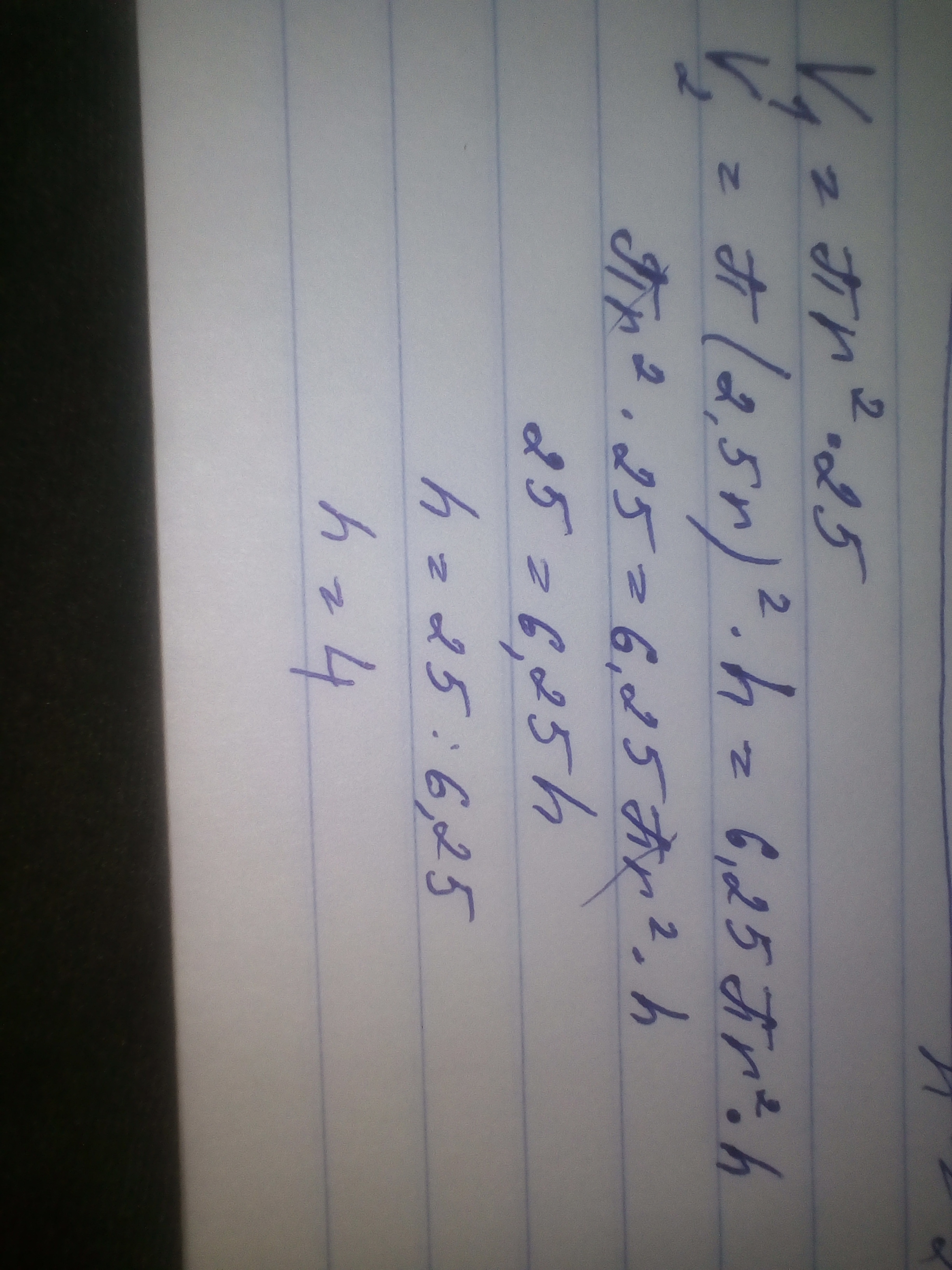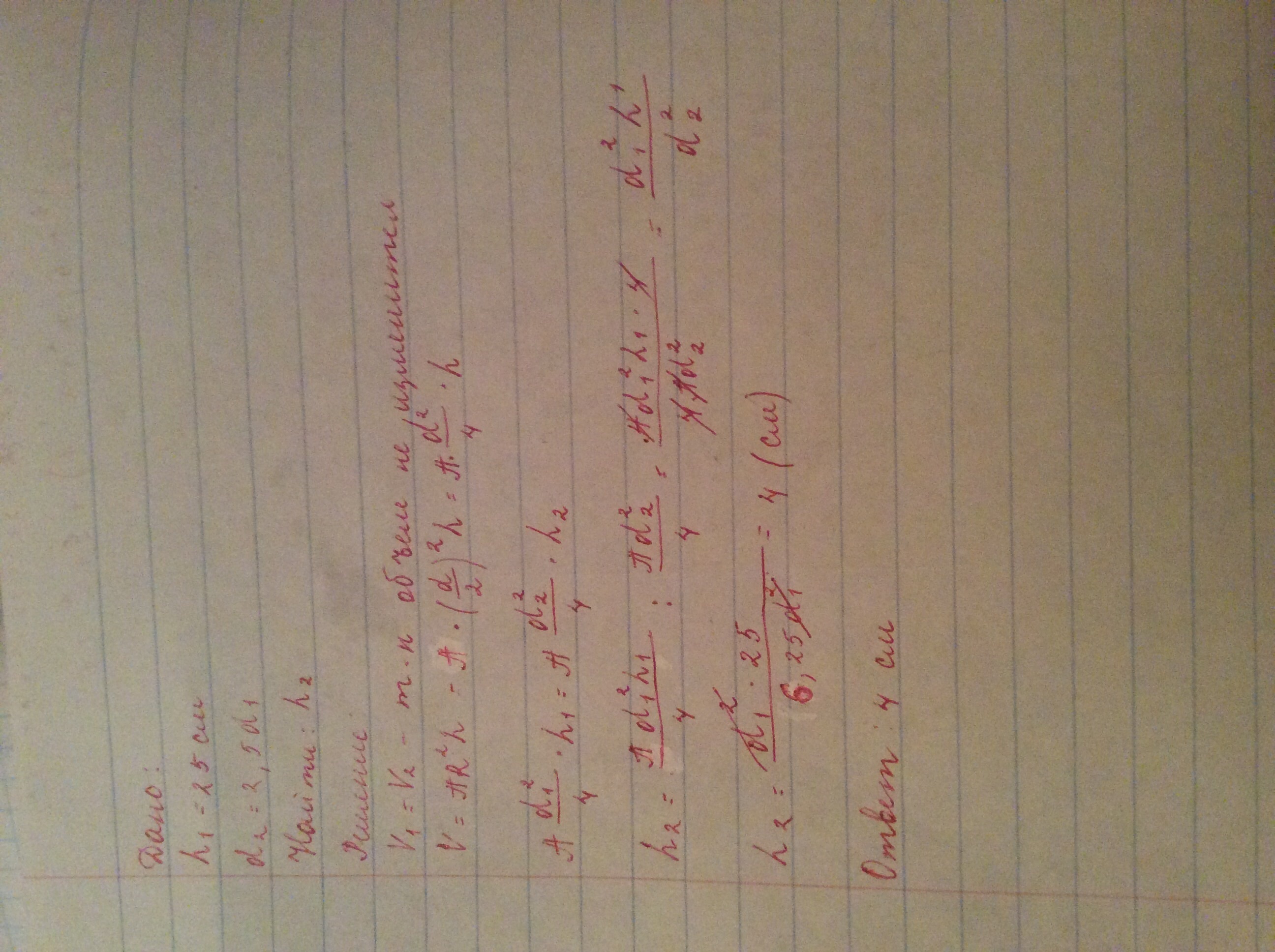 В цилиндрическом сосуде уровень жидкости достигает 25 см. На какой высоте будет находиться уровень жидкости, если её перелить во второй цилиндрический сосуд, диаметр основания которого в 2,5 раза больше диаметра основания первого? Ответ выразите в см.