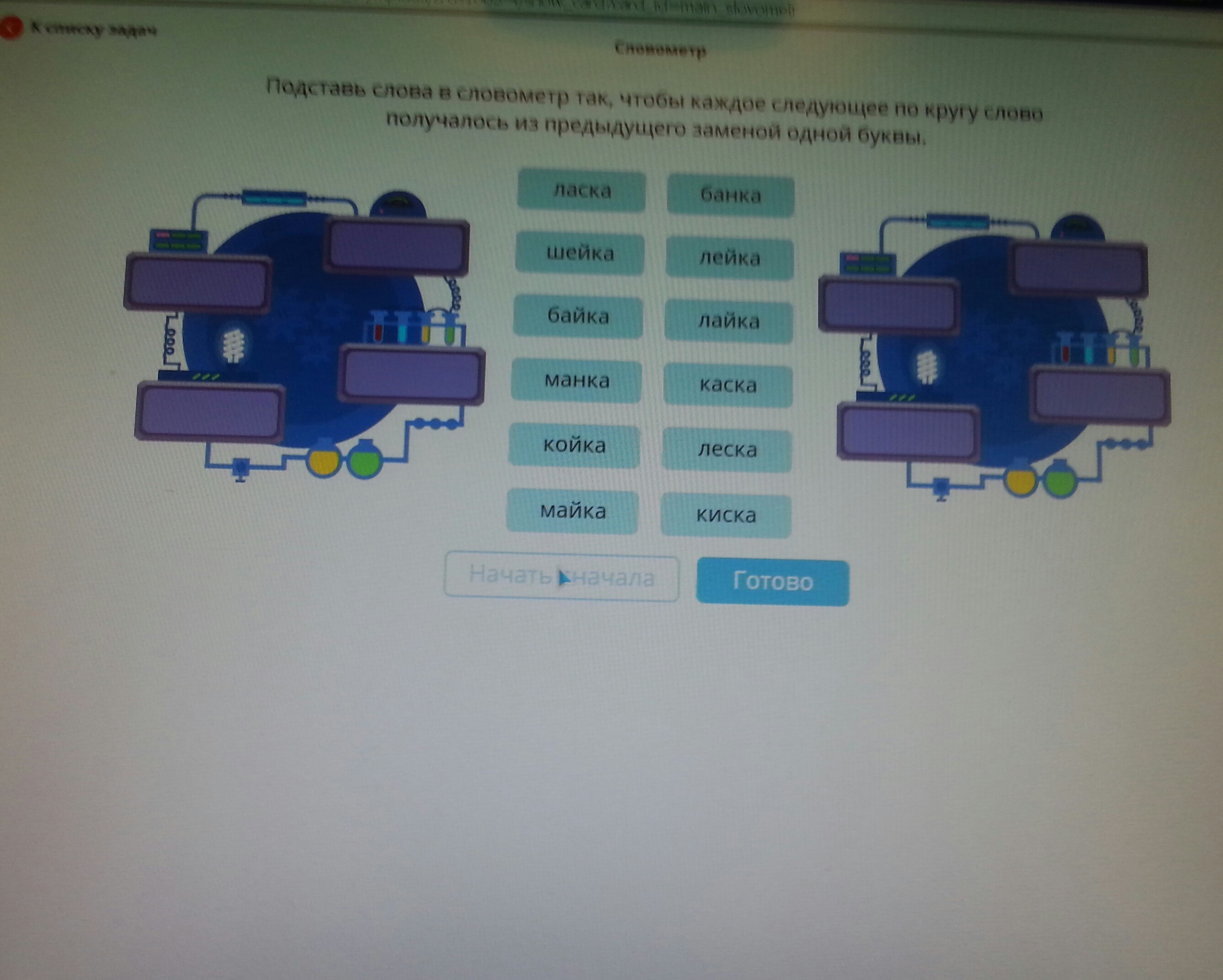 Подставь слово в словометр так, чтобы каждое следующие по кругу слово получалось из предыдущего заменой одной буквы.