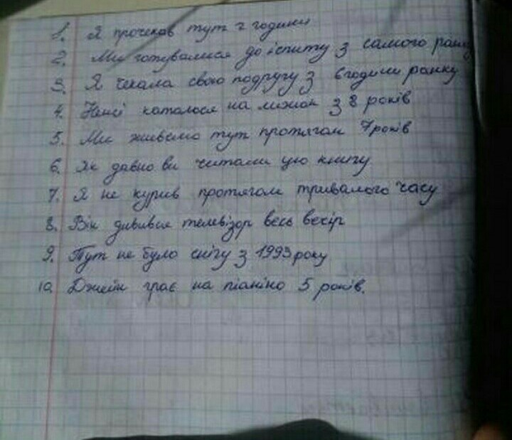 1. I've been waiting here for 2 hours.2. We've been preparing for the exam since early morning.3. I've been waiting for my friend since 6 a.m.4. Nancy has been skiing since she was 8.5. We've been here for 7 years.6. I haven't been smoking for a long time.7. How long ago have you read this book?8. He's been watching TV for the whole evening.9. There has been no snow since 1993.10.Jane has been playing the piano simce she was 5.