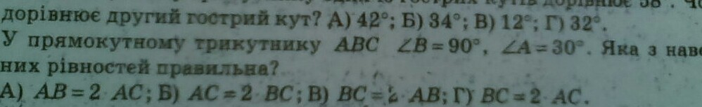 У прямокутному трикутнику АВС кут В=90,кут А=30.яка знаведених ривностей правильна?