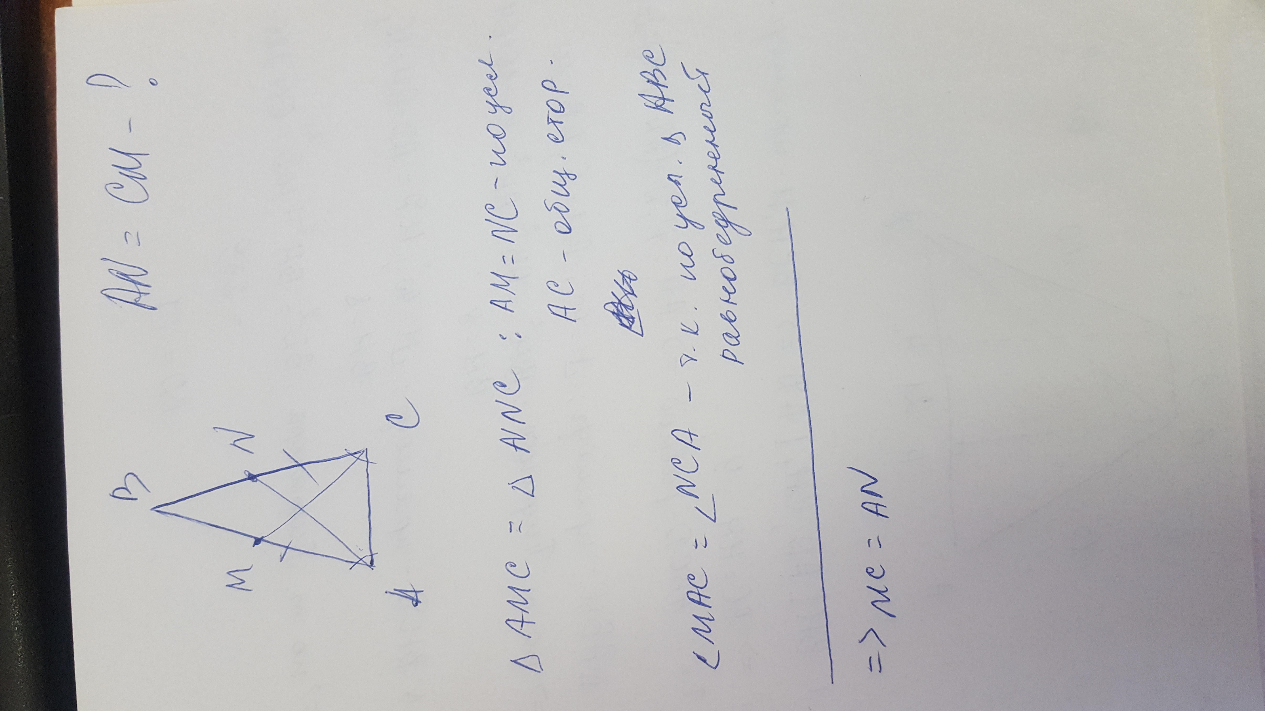 В треугольнике АВС (АВ=ВС) на сторонах АВ и ВС отложены равные отрезки АМ и СN соответственно. Докажите, что AN=СМ.