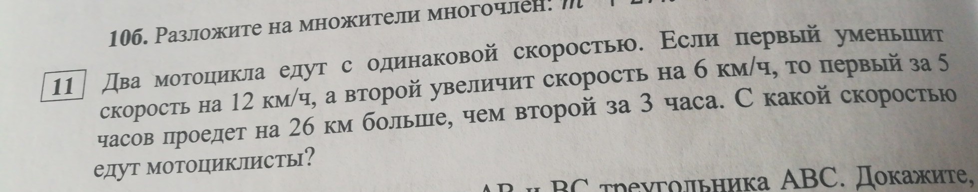 Два мотоциклиста едут с одинаковой скоростью. Если первый уменьшит скорость на 12 км/ч, а второй увеличит скорость на 6 км/ч, то первый за 5 часов проедет на 26 км больше чем второй за 3 часа. С какой скоростью едут мотоциклисты?