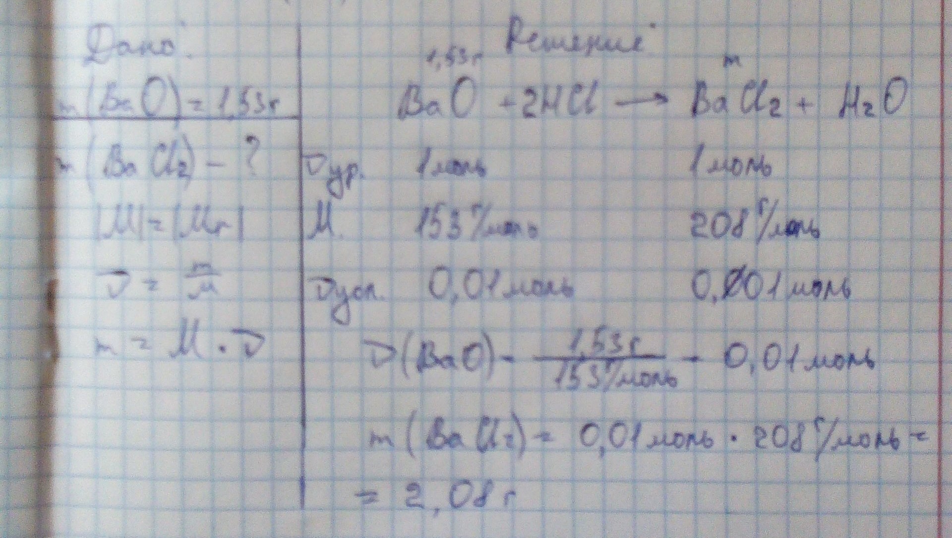 Вычислить какая масса соли получится при взаимодействии оксида бария массой 1.53 грамм с достаточным количеством HCl