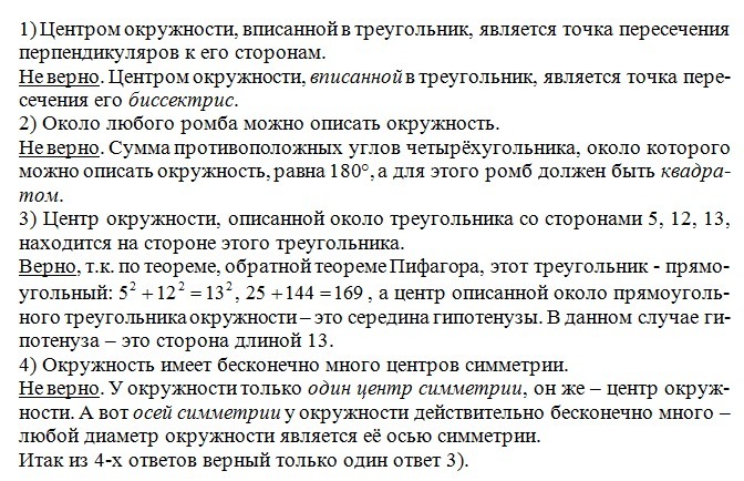 ) Центр окружности, описанной около треугольника со сторонами 5, 12, 13, находится на стороне этого треугольника.
