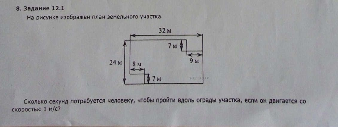 на рисунке изображён план земельного участка. сколько секунд потребуется человеку, чтобы пройти вдоль ограды участка если он двигается со скоростью 1 метров секунду.