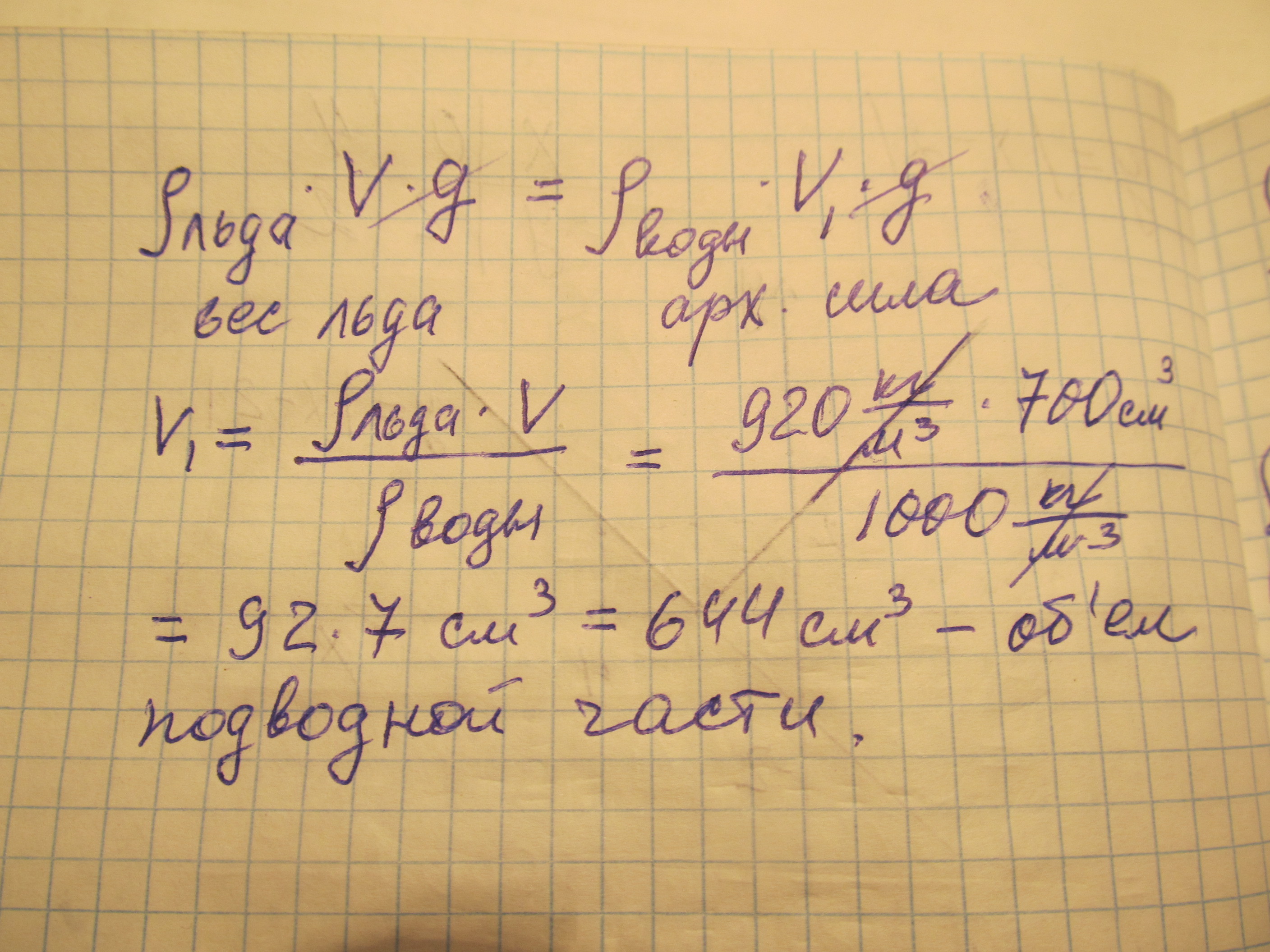 Найдите объем подводной части льда. Дайте ответ в см3 с точностью до целых.