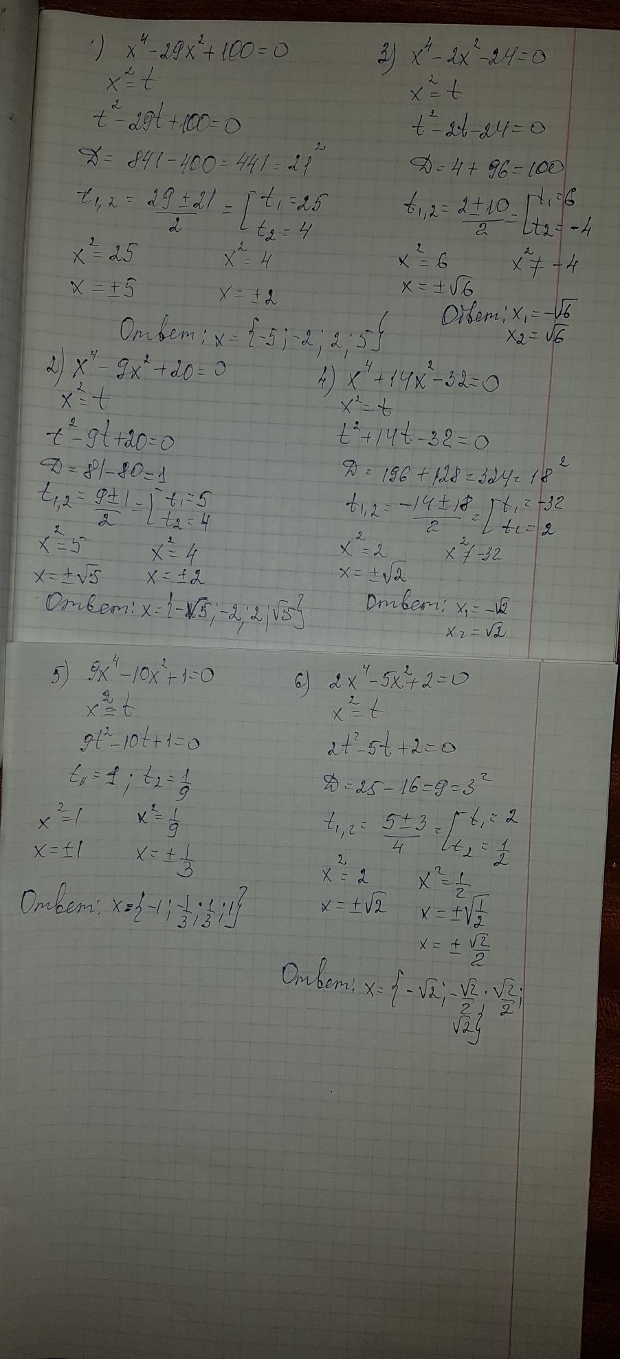 Здравствуйте помогите пожалуйста с биквадратными уравнениями 1)x4-29x2+100=0 2)x4-9x2+20=0 3)x4-2x2-24=0 4)х4+14х2-32=0 5)9х4-10х2+1=0 6)2х4-5х2+2=0.