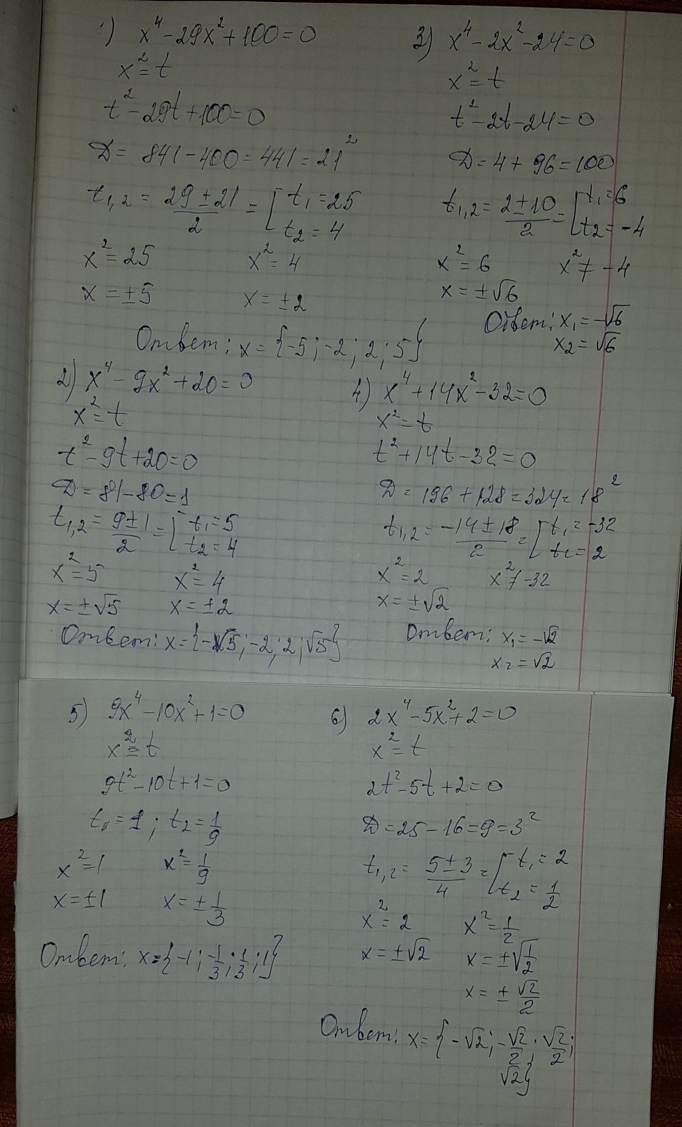 Здравствуйте помогите пожалуйста с биквадратными уравнениями 1)x4-29x2+100=0 2)x4-9x2+20=0 3)x4-2x2-24=0 4)х4+14х2-32=0 5)9х4-10х2+1=0 6)2х4-5х2+2=0.
