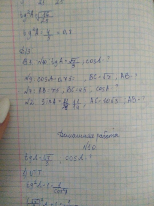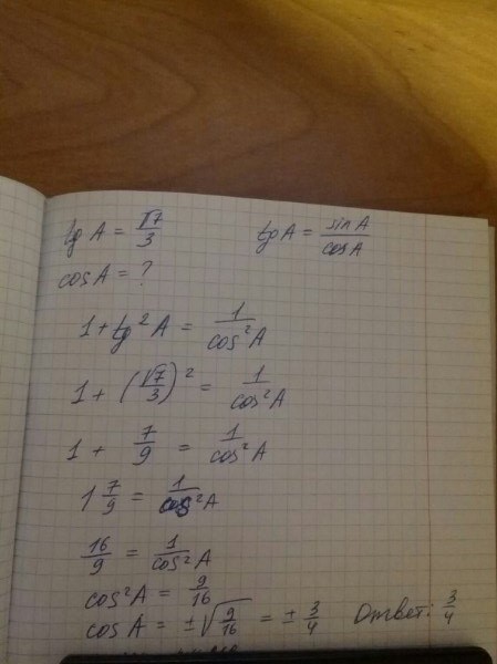 итак, расчет приведен в файле, но у вас не указана четверть , а знак перед корнем нужно выбрать в соответствии с четвертью данного угла (косинус положительный в I и IV четвертях, тангенс положительный в I и III четвертях)