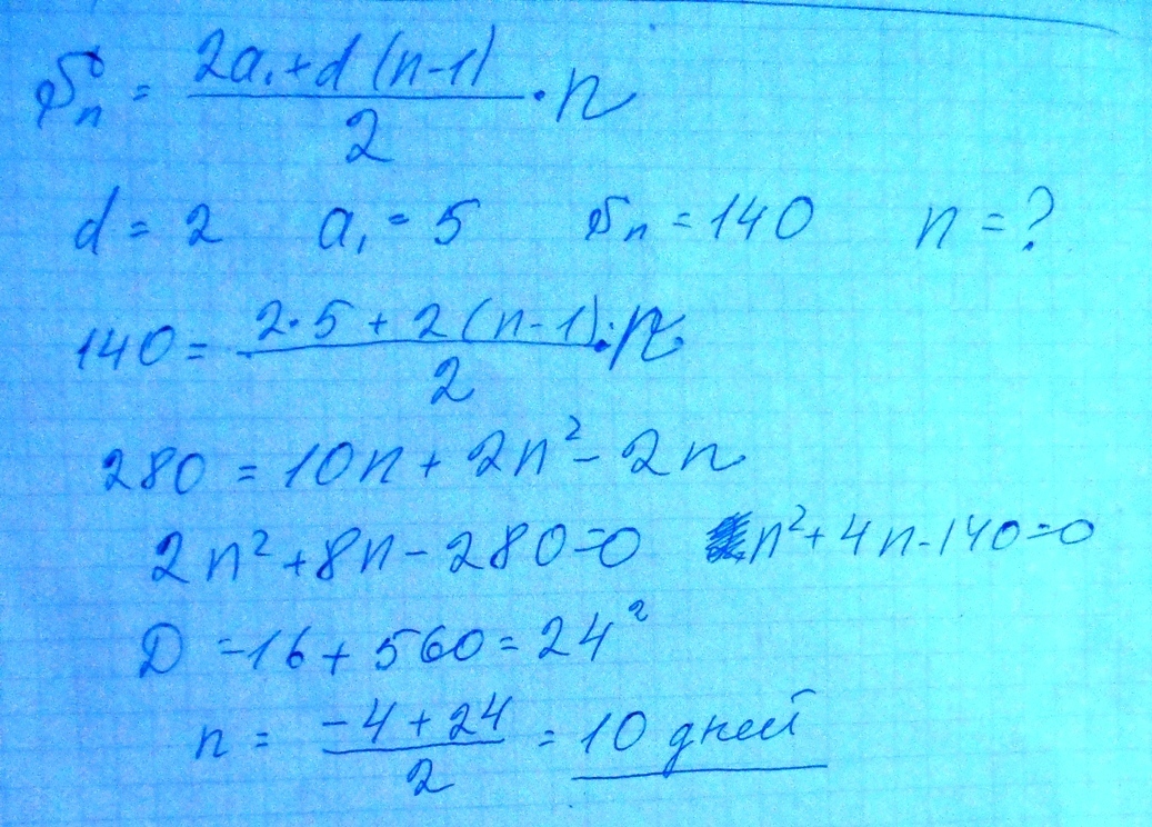 Туристы запланировали пройти по реке 140 км. Сколько дней туристы будут в походе, если в первый день прошли 5 км, а в каждый последующий день они будут проходить расстояние на 2 км больше, чем в предыдущий.