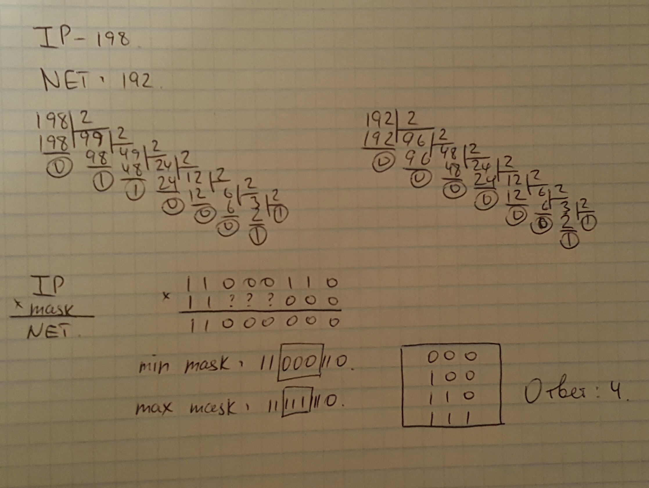Работаем с сомнительными разрядами. Понимаем, что их минимальное значение - 000, максимальное - 111. В этом диапазоне находим всевозможные значения сомнительных разрядов маски, помня о правиле.