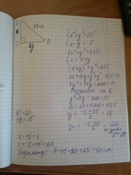 Срочно! 50 баллов! Геометрия! Гипотенуза прямоугольного треугольника равна 25 см Если разница между его катетами равна 5 см то Чему равен его периметр