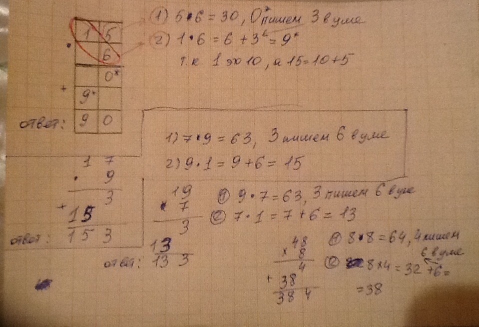 Давайте разберем на примере, 15*6, сначала умножаете 5*6=30, 0 пишем, 3 в уме, потом 1*6=6+3 что мы запоминали ранее =9