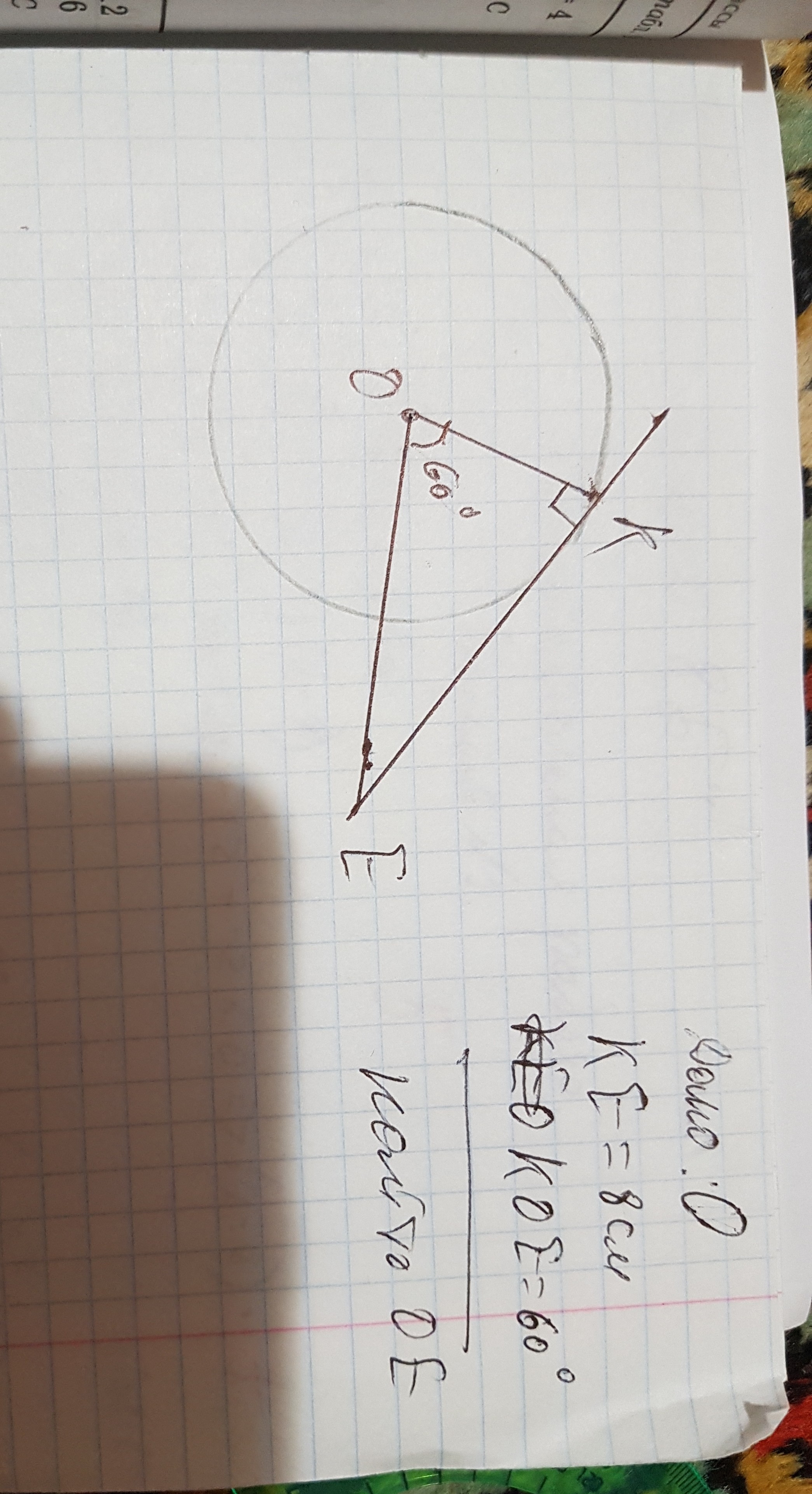 Дано окружность. КЕ=8. угол КОЕ =60градусов. КЕ касательная. Найти ОЕ