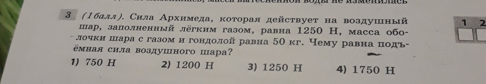 сила Архимеда которая действует на воздушный шар заполняющая легким газом равна 1250 Ньютонов масса оболочки шара с газом из гондолы равна 50 кг Чему равна подъемная сила воздушного шара
