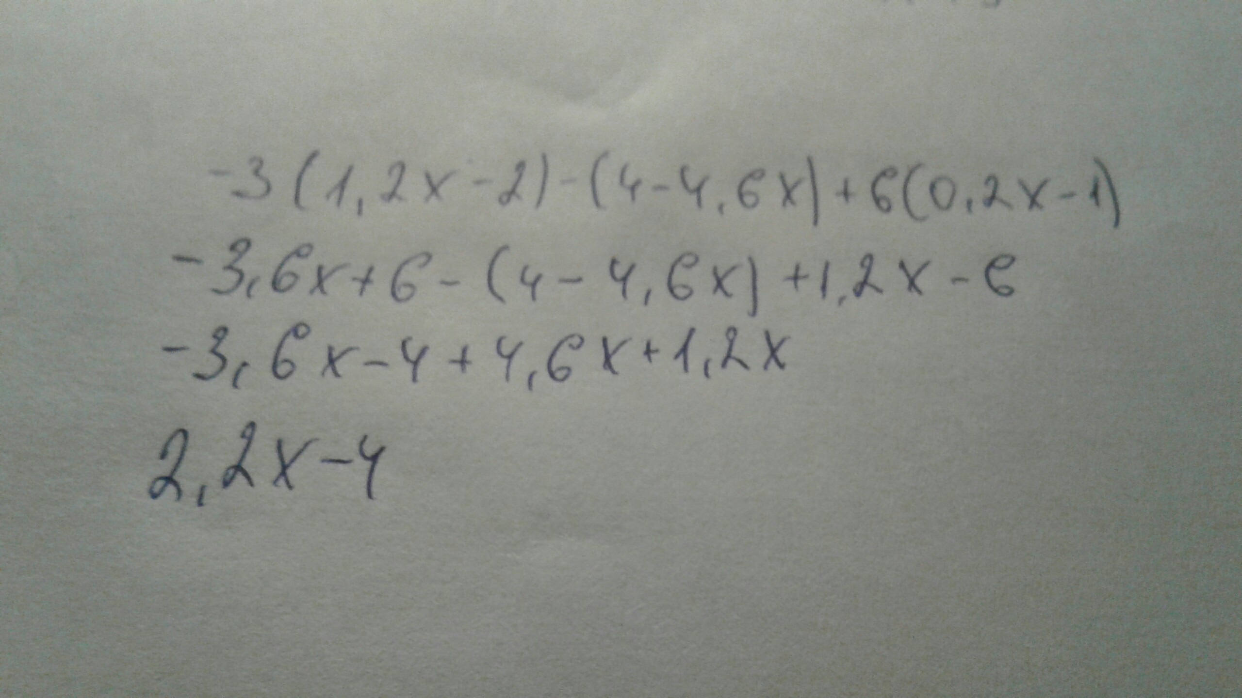 Упростите выражение -3(1,2х-2)-(4-4,6х)+6(0,2х-1) Вычислите его значение при х=-верху 15 а внизу 22 дробь как .напишите пожалуйста полное решение