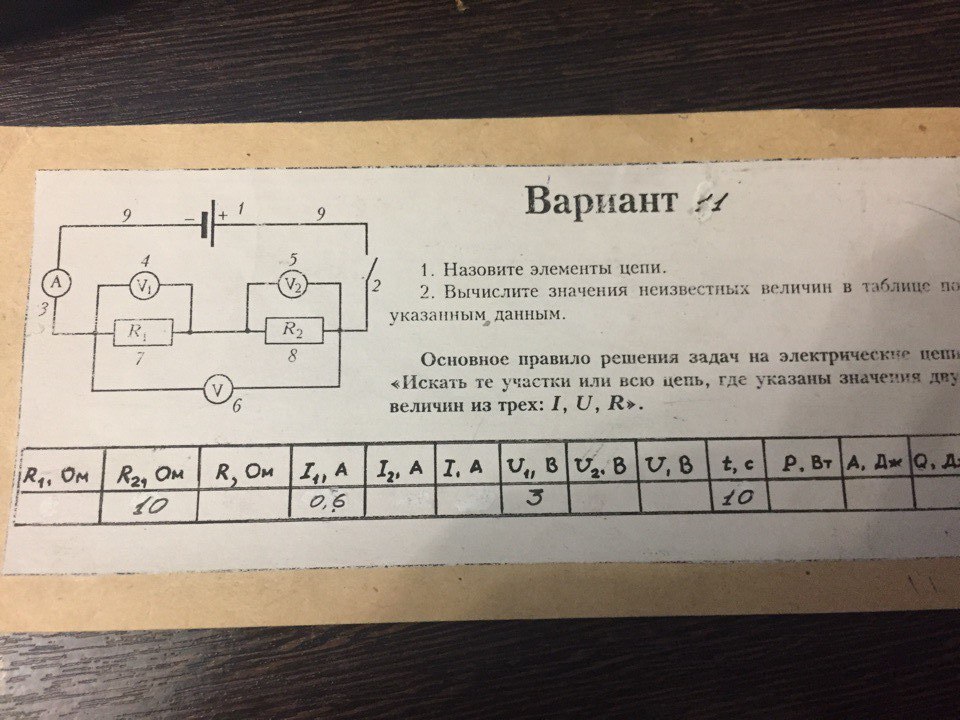 Решите пожалуйста!Физика,1 назовите элементы цепи,2 вычислите значения неизвестных величин в таблице по указанным данным!