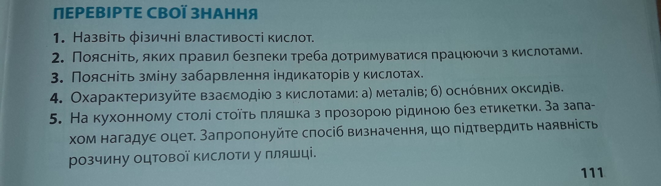 1. За стандартних умов багато кислот — рідини (H2S04, HN03), але є й тверді кислоти — ортофосфатна Н3Р04, метафосфатна НРОз, силікатна (драглиста маса) H2Si03. Всі кислоти важчі за воду. Деякі кислоти леткі (НСl, HN03), вони мають задушливий запах. Майже всі кислоти безбарвні.