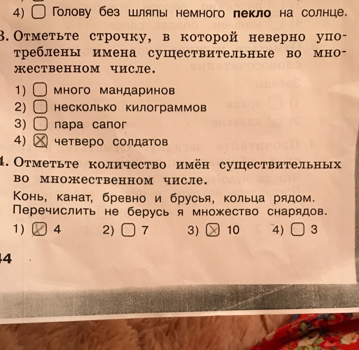 А вот в 4м во мн.числе: брусья, кольца и снарядов, т.е. 4 ответ