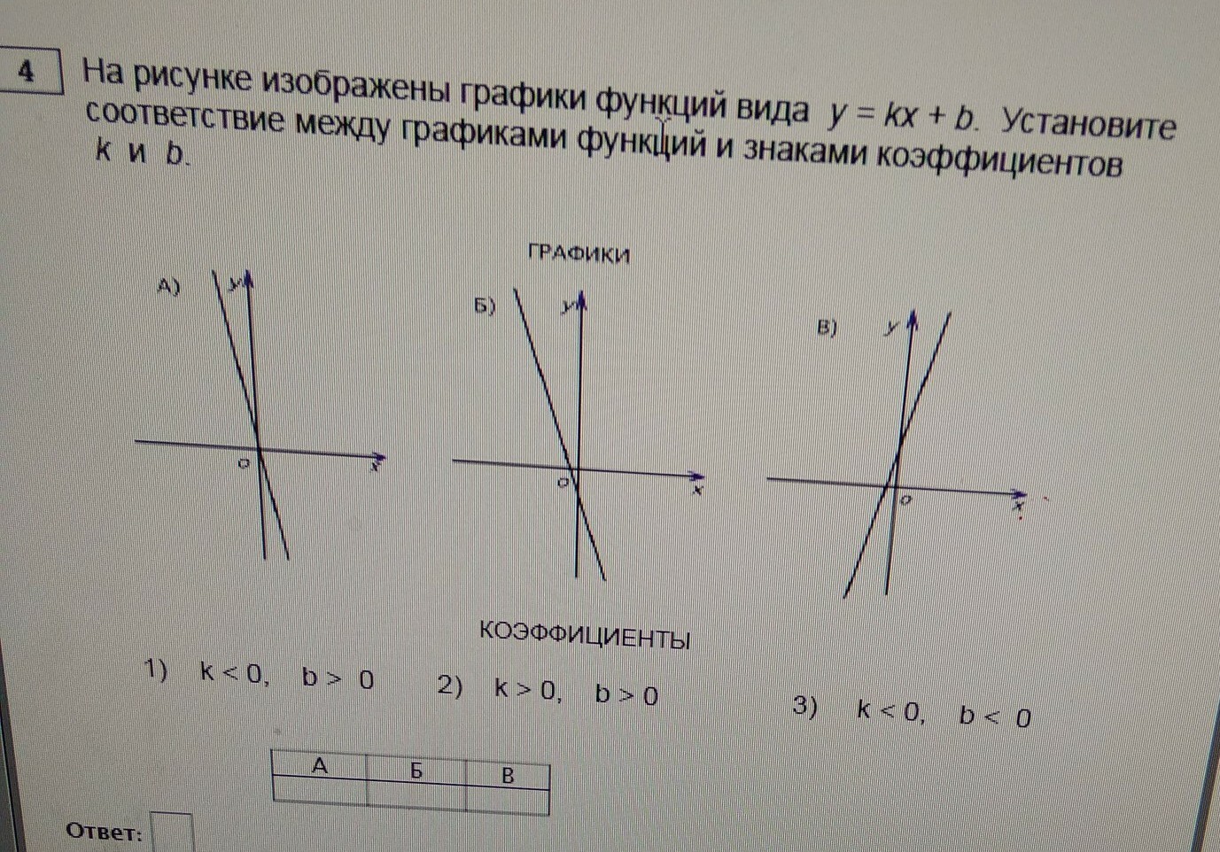 На рисунке изображены графики функции вида y=kx+b.Установите соответствие между графиками функций и знаками коэффициентов k и b.