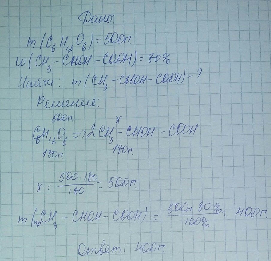 Глюкоза массой 500 г была подвергнута молочнокислому брожению. Определите массу образовавшейся молочной кислоты, если реакция прошла с выходом 80%.