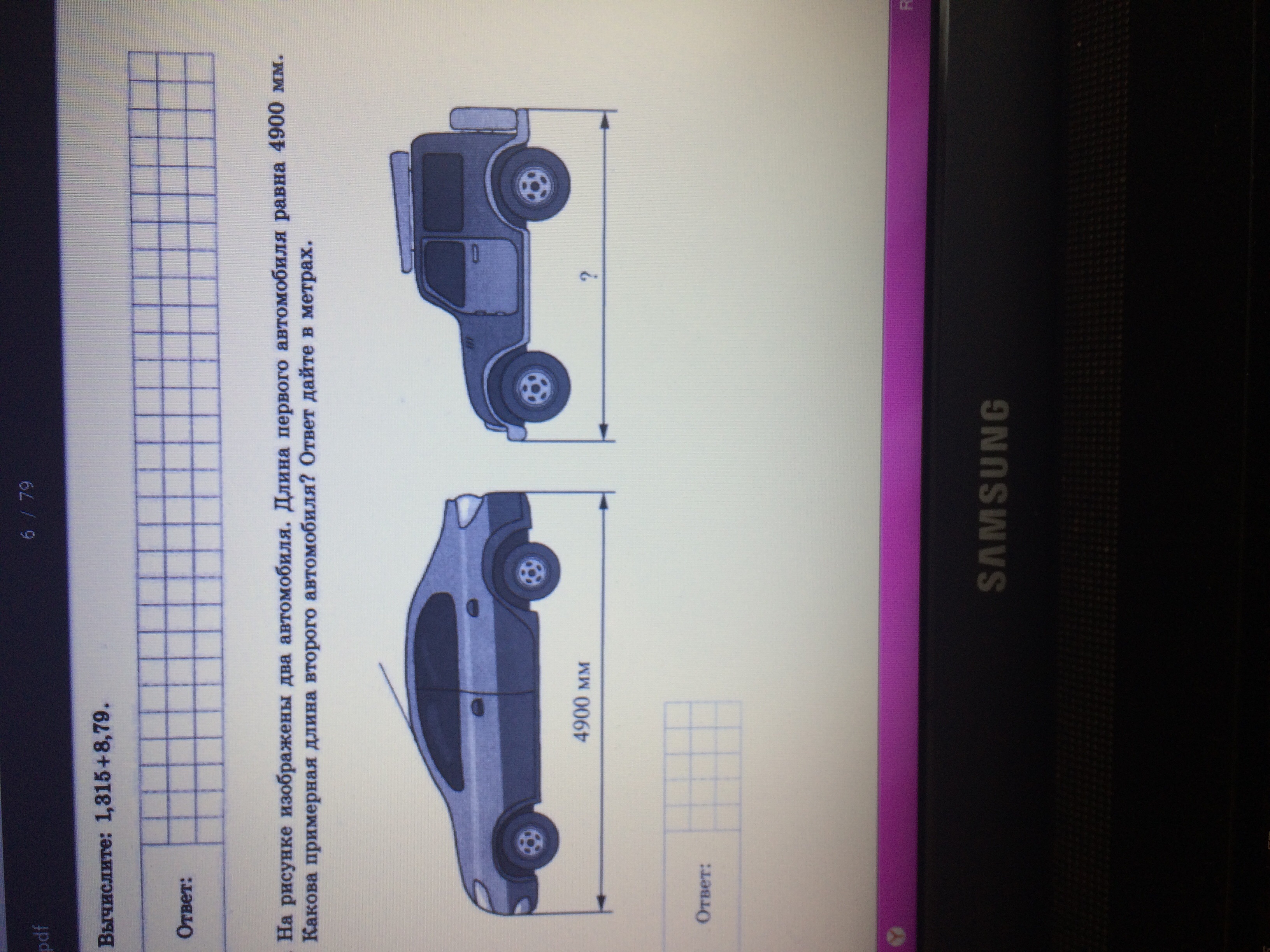 На рисунке изображены два автомобиля. Длина первого автомобиля 4900мм. Какова примерная длина второго автомобиля. Ответ дайте в метрах.
