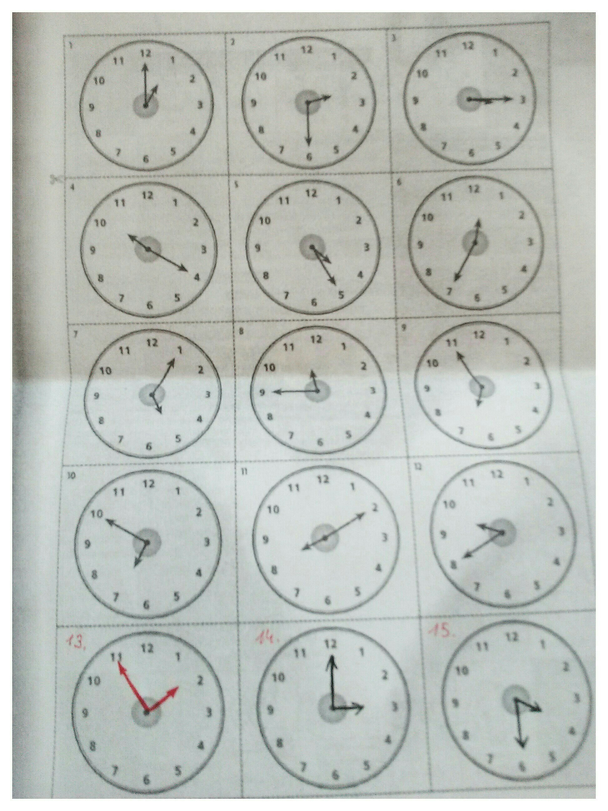Нужно написать время, которое показано на всех 15 часах английскими буквами (4 класс)