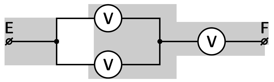 На рисунке представлена схема фрагмента электрической цепи, состоящего из трёх вольтметров. Два вольтметра имеют одинаковое сопротивление, а один – вдвое большее.К концам E и F этого фрагмента прикладывают постоянное напряжение