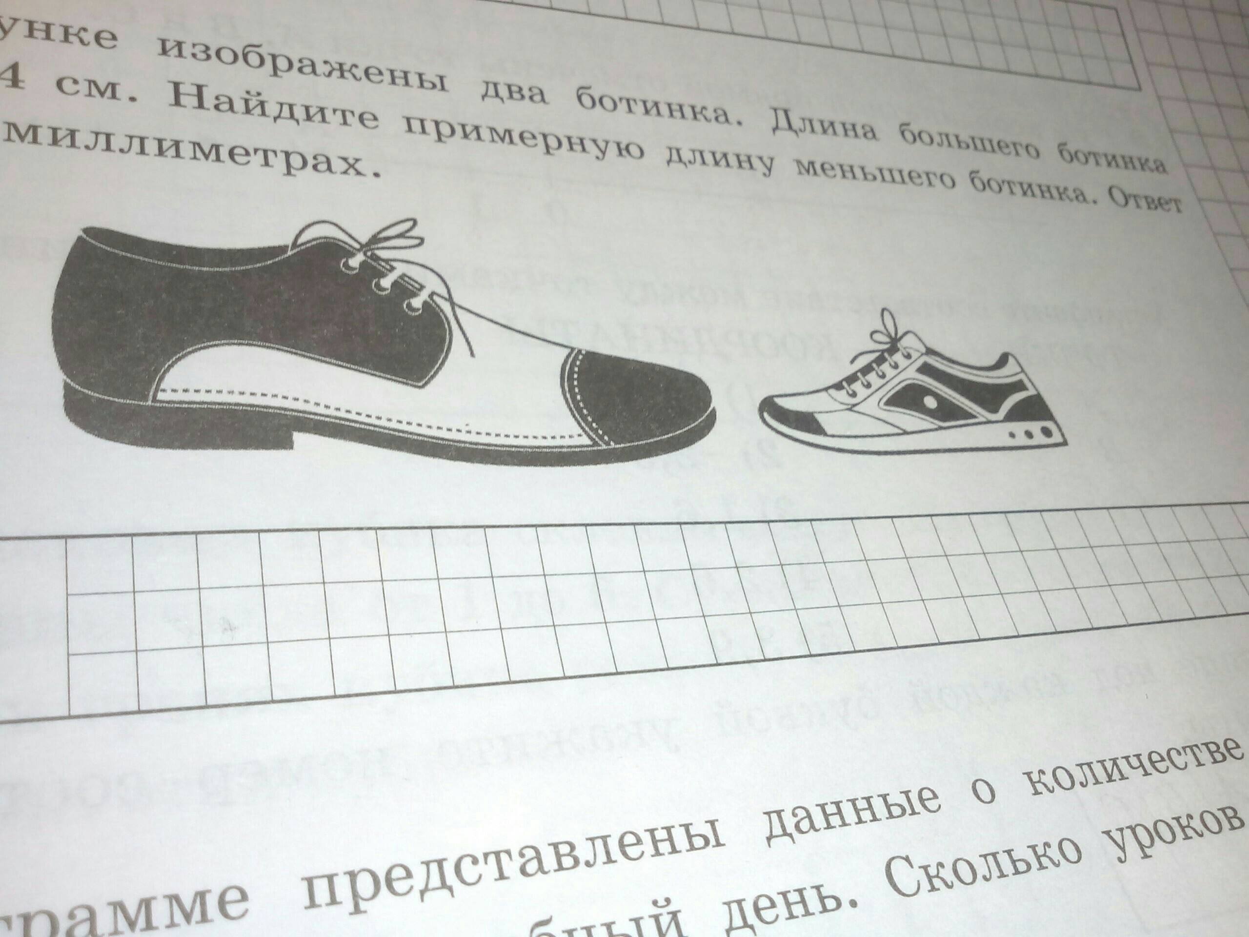 на рисунке изображены два ботинка длина большего ботинка равна 24 см найдите примерную длину меньшего ботинка Ответ дайте в мтллиметрах
