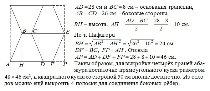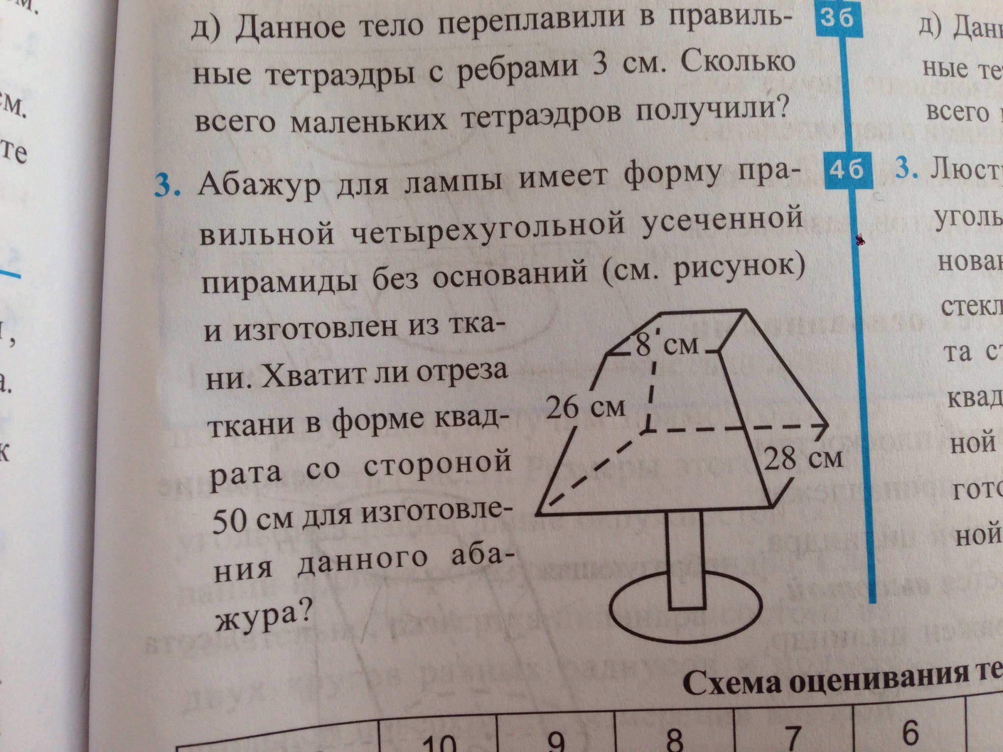 абажур для лампы имеет форму правильной четырехугольной усеченной пирамиды без основания и изготовлен из так а не хватит ли отрезка ткани в форме квадрата со стороной 50 см для изготовления данного абажура. ... Малое Основание 8 см.ребра 26 см.основание 28 см.