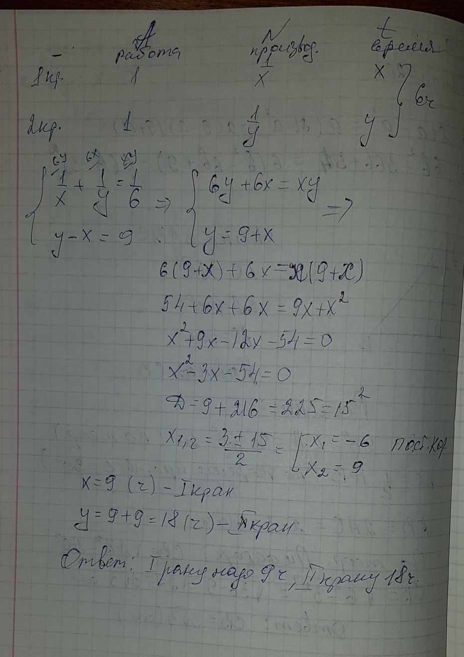 Два крана, работая вместе, могут разгрузить баржу за 6 ч. За какое время может разгрузить эту баржу первый кран, работая в одиночку, если ему потребуется для этого на 9 ч меньше, чем второму крану?