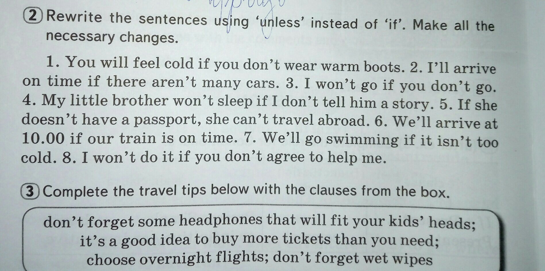 You will feel cold unless you wear warm boots. I’ll arrive on time unless there are many cars. I won’t go unless you go. My little brother won’t sleep unless I tell him a story. unless she has a passport she can travel aboard . We’ll arrive at 10 unless our train is on time. We’ll go swimming unless it is cold. I won’t do it unless you agree to help me
